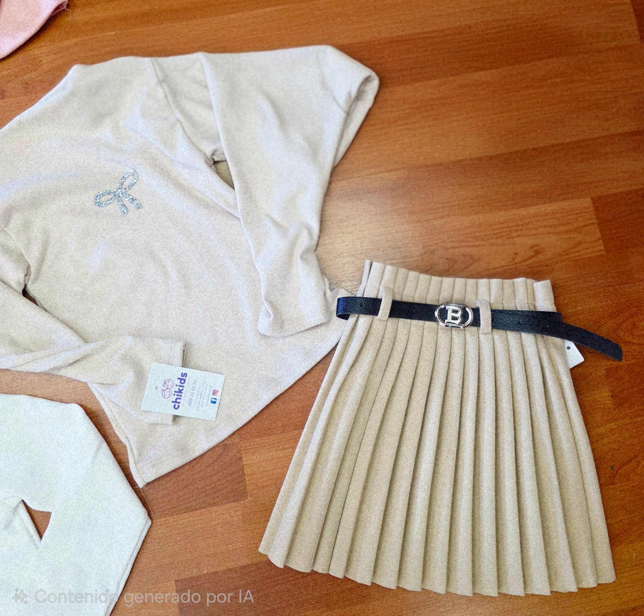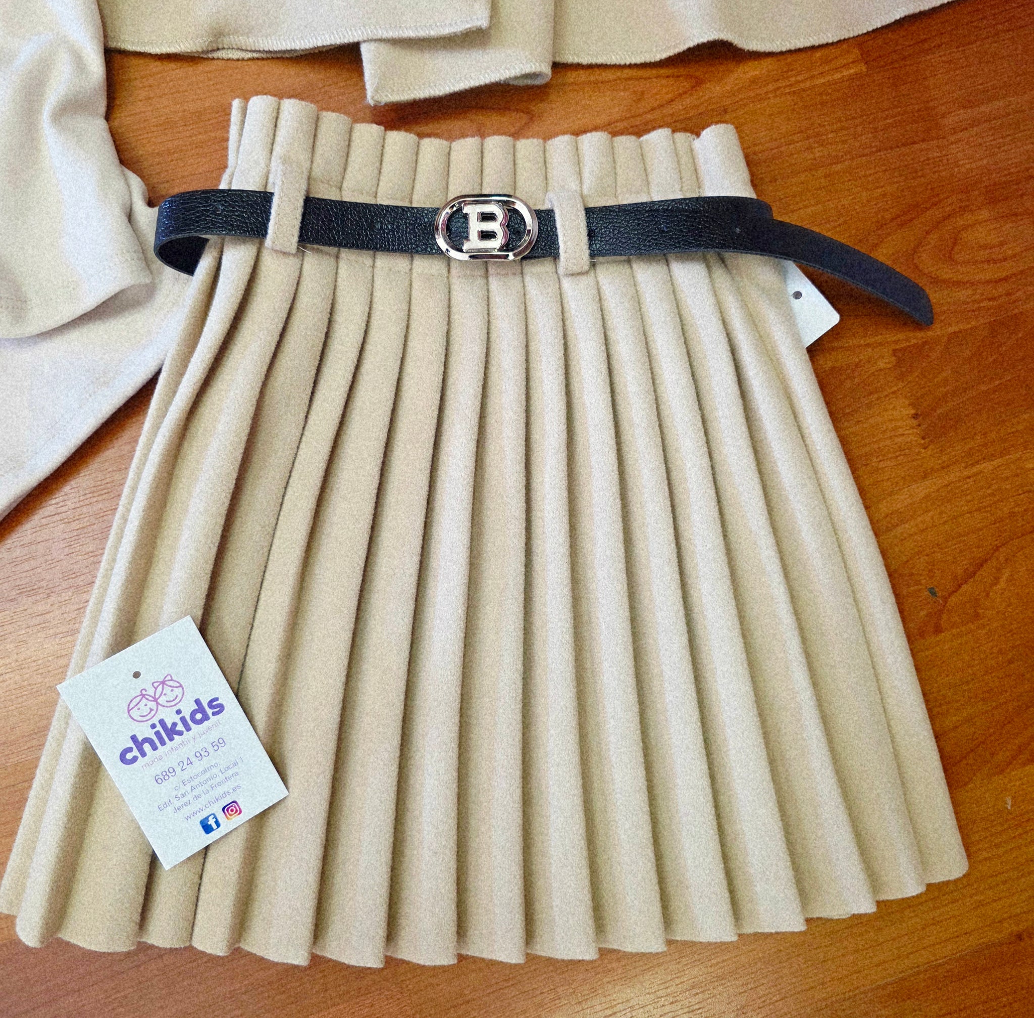 Conjunto compuestos de camiseta marfil de manga larga, super calentita y falda tableada marfiñ de talle alto