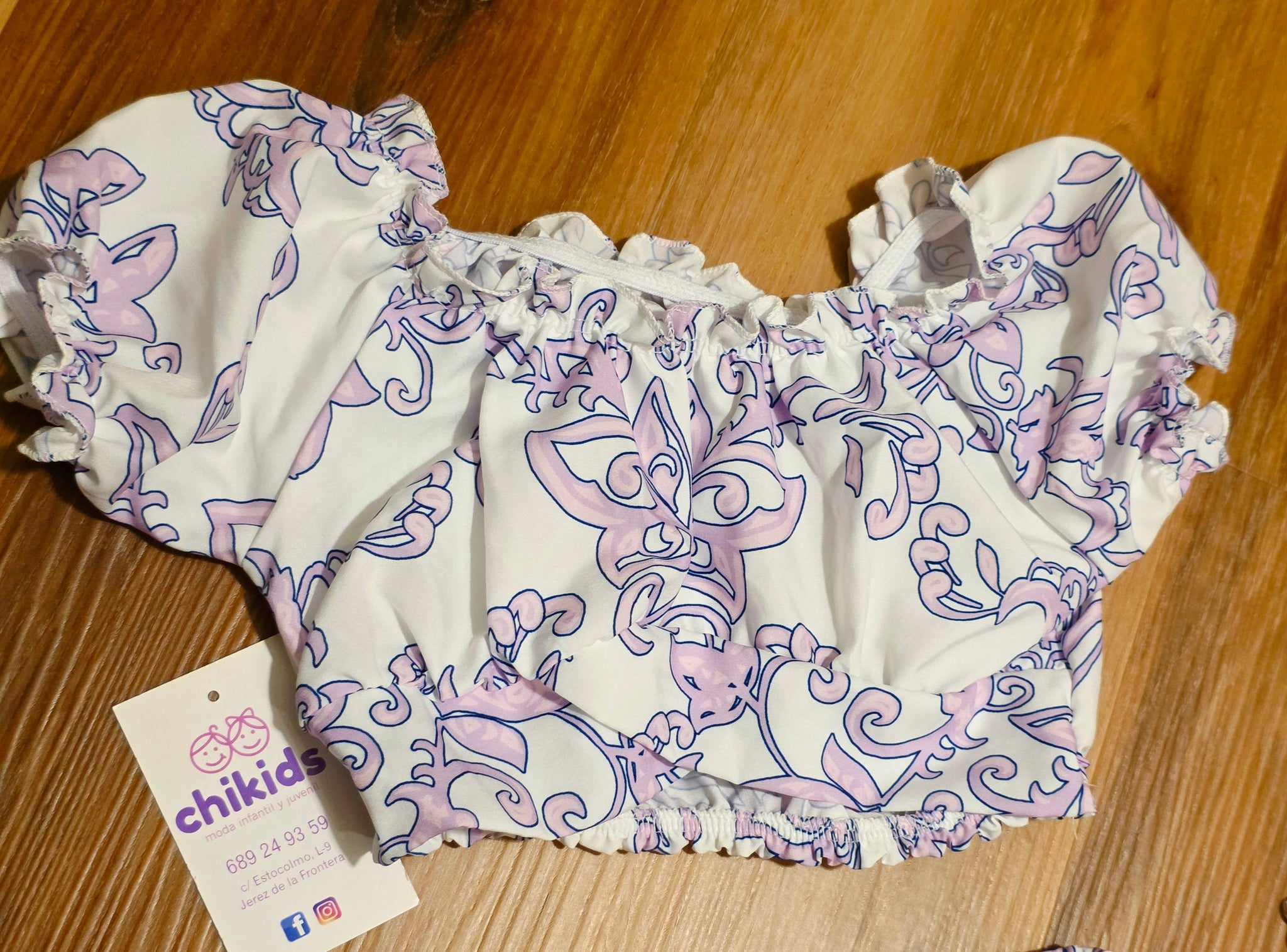 Conjunto compuesto de top a juego de pantalón y bolso blanco y malva