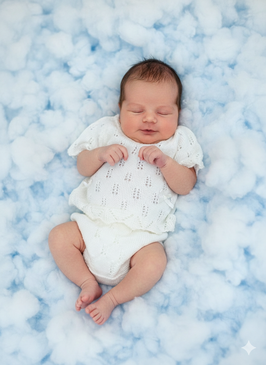 Conjunto de hilo calado compuesto de jersey manga corta y ranita a juego.