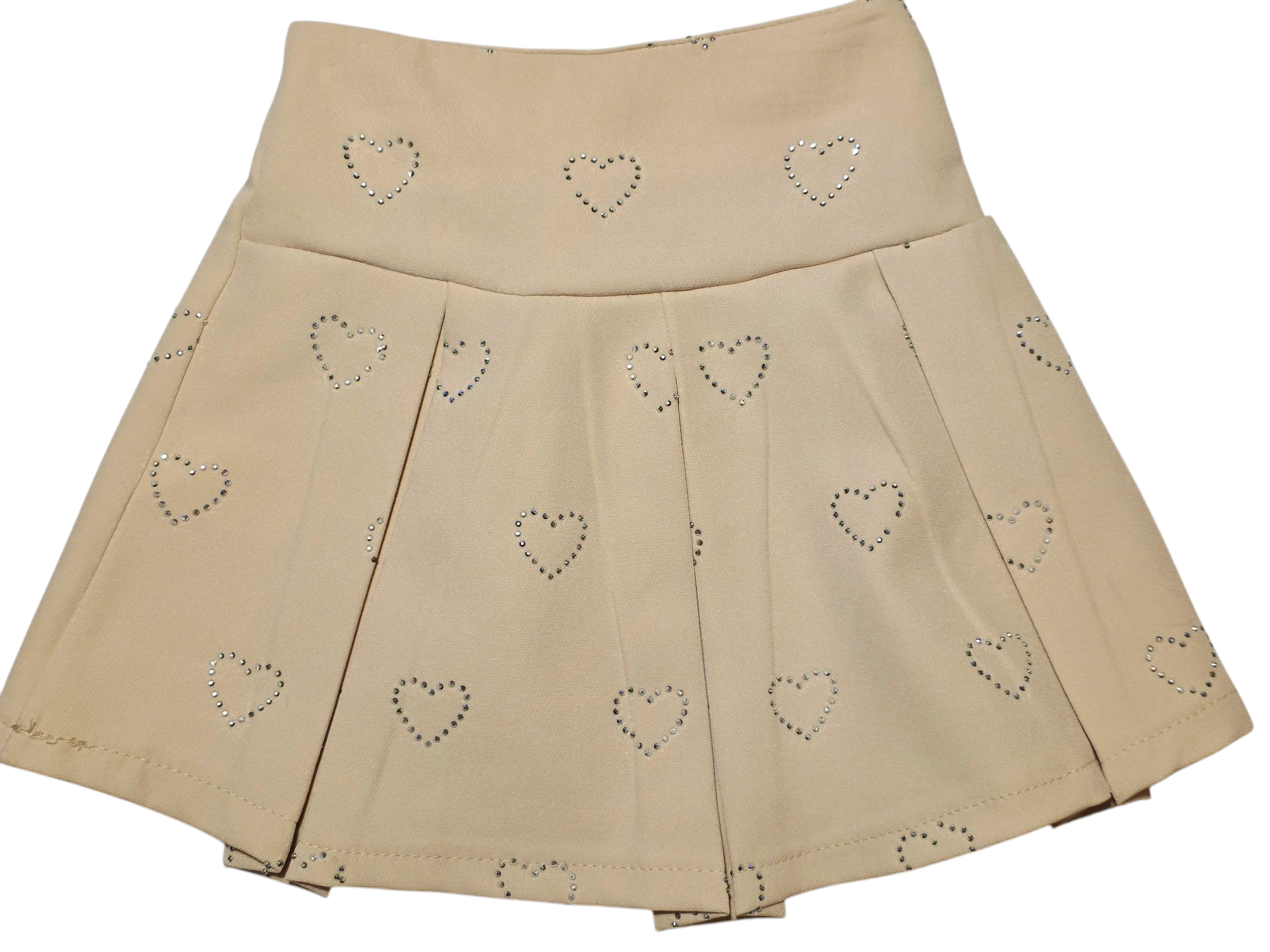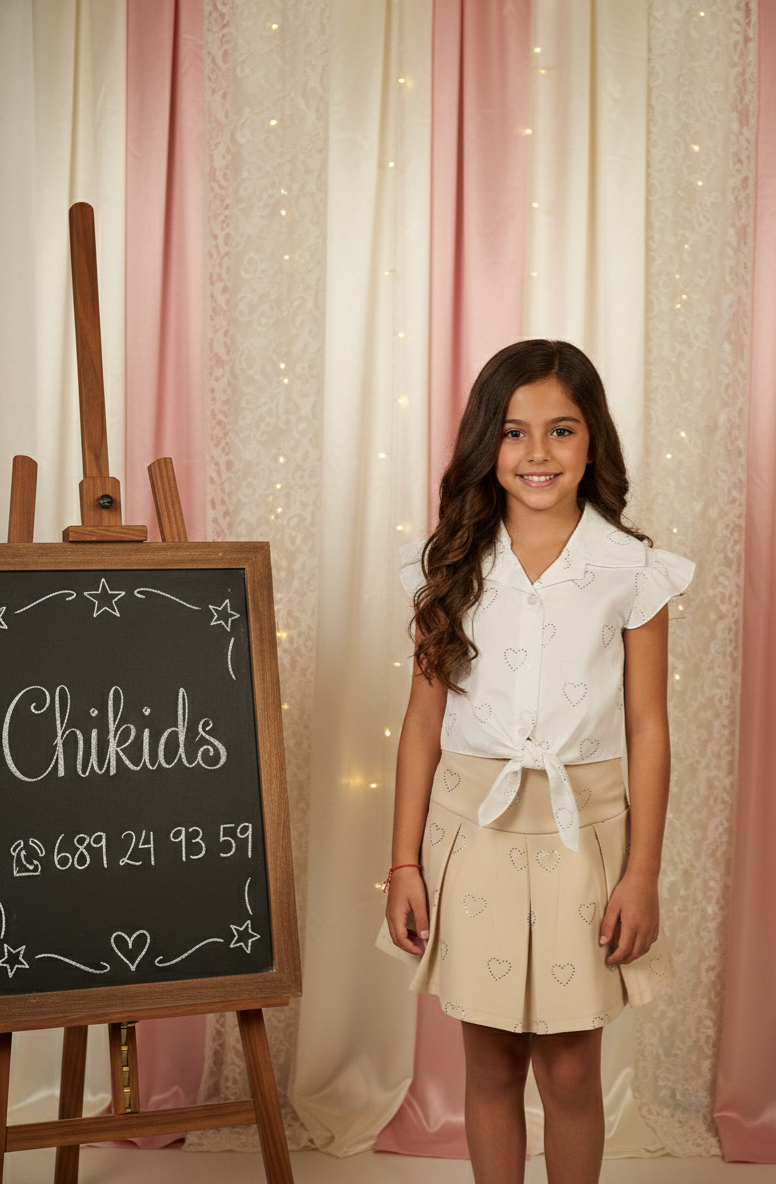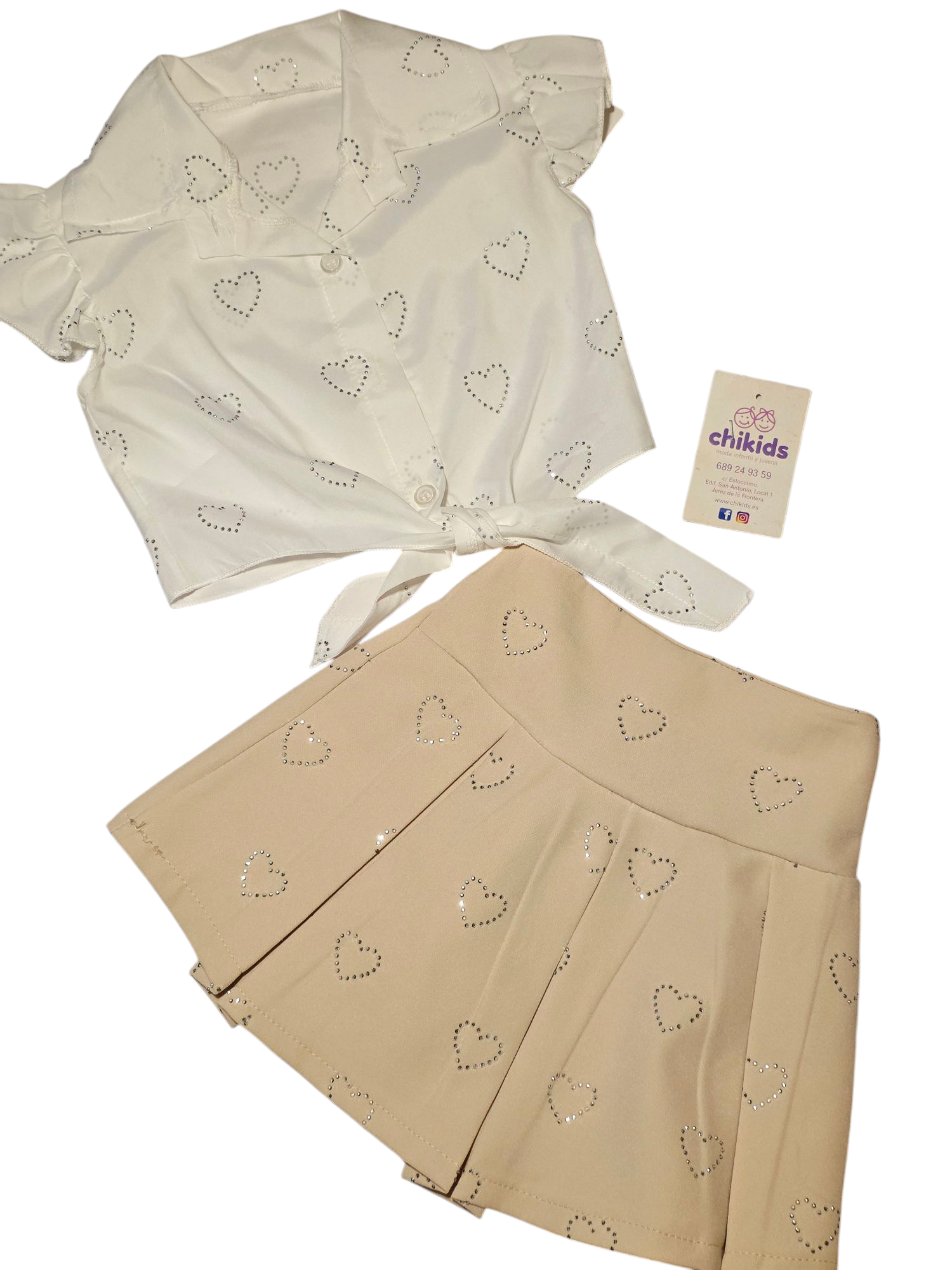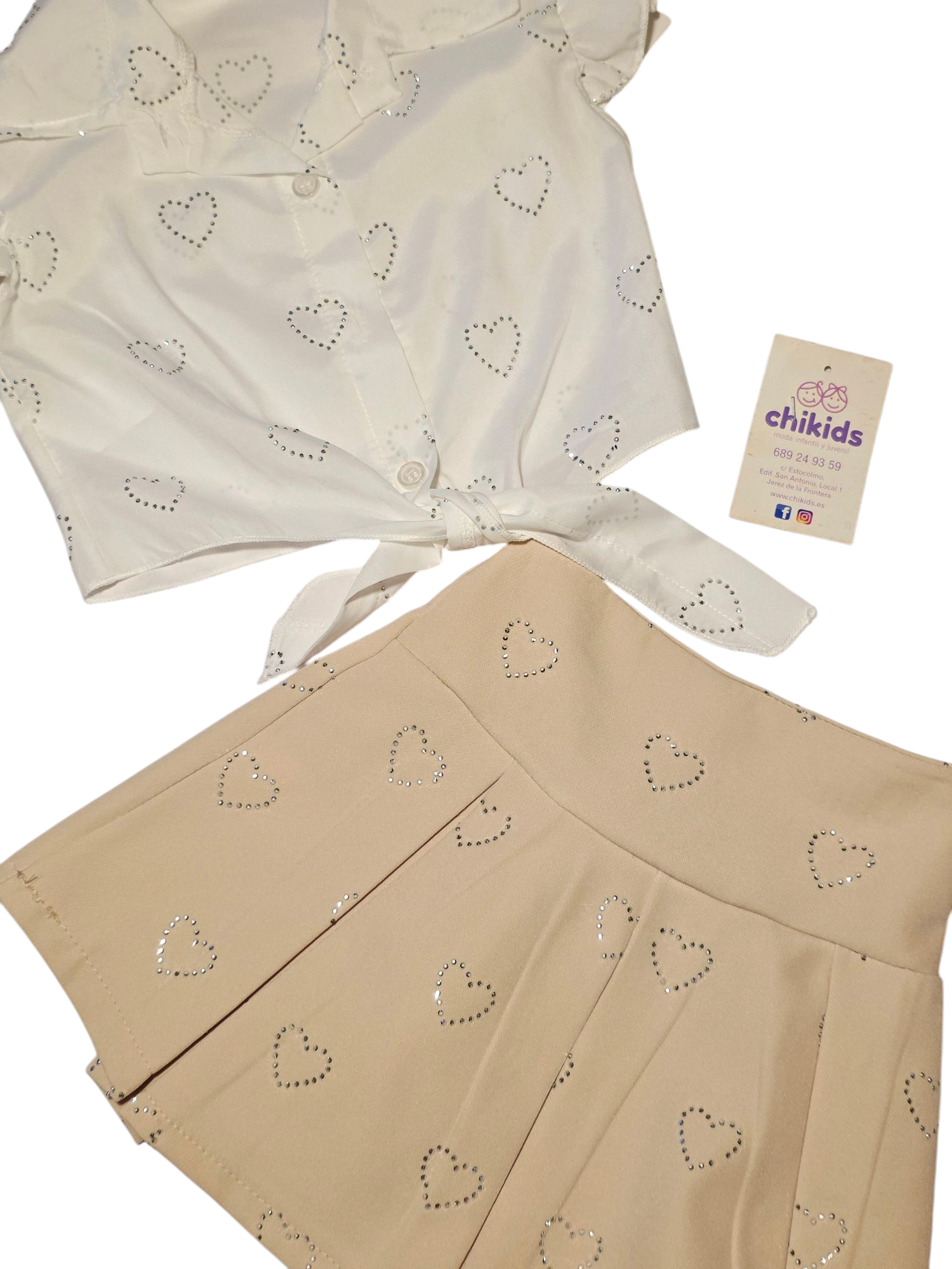 Conjunto compuesto de camisa blanca anudada con detalle de corazones de brillo a juego de falda marfil tableada con corazones de brillo plata.