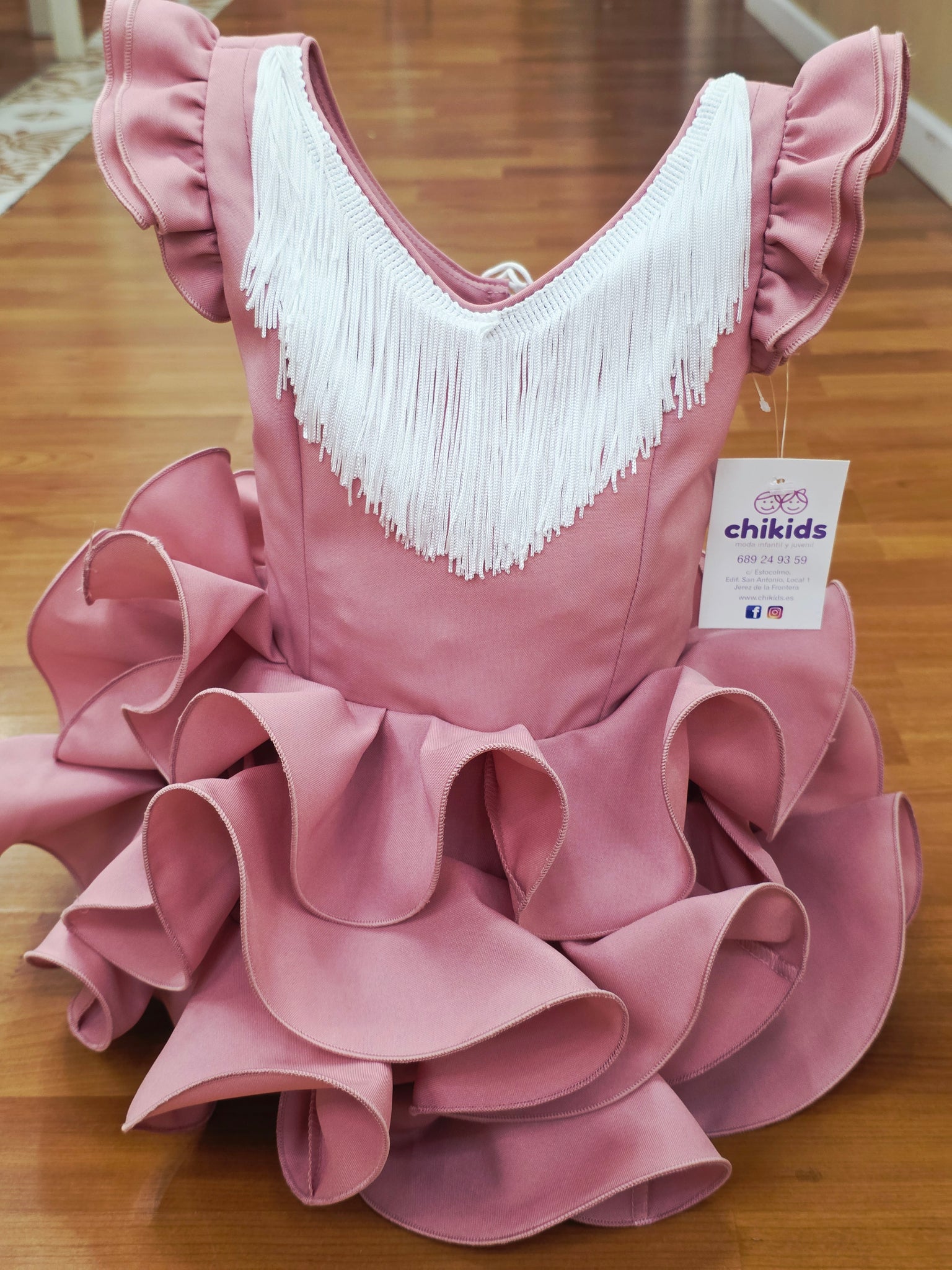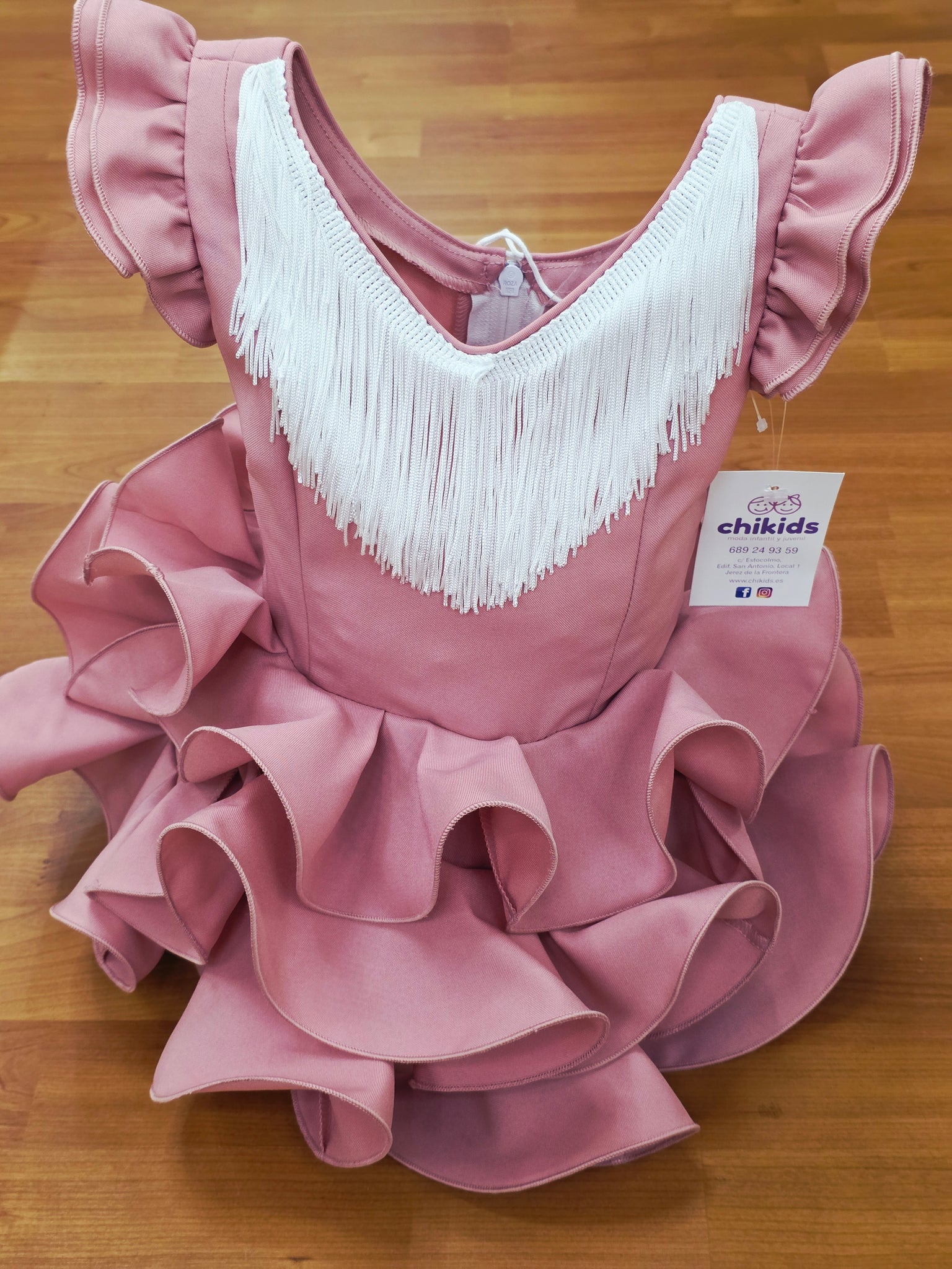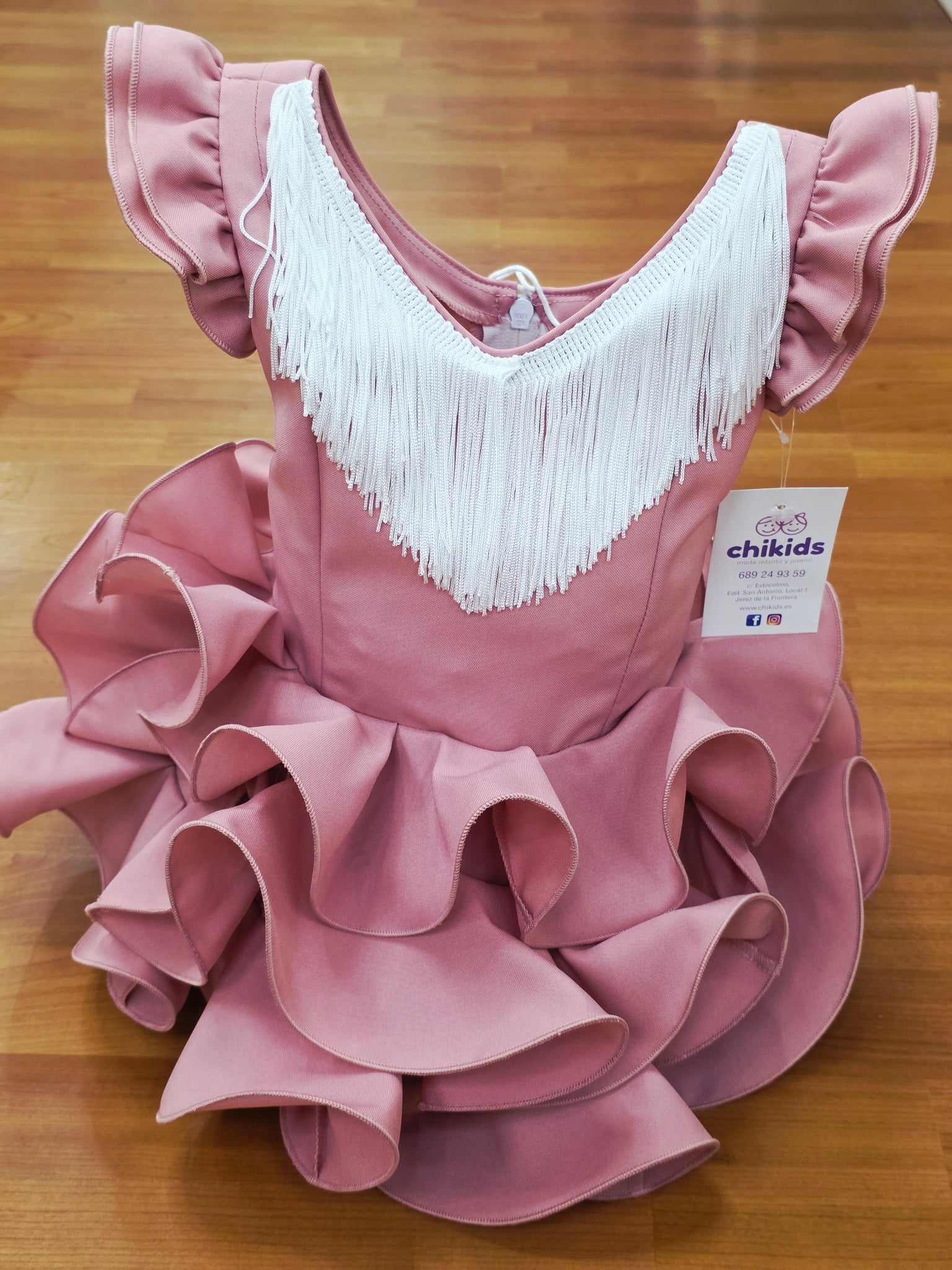 Traje/vestido de flamenca "Cayetana" Rosa empolvado con tres volantes y flecos blanco, ideal para la Feria , el Rocío , Romería, candelarias.