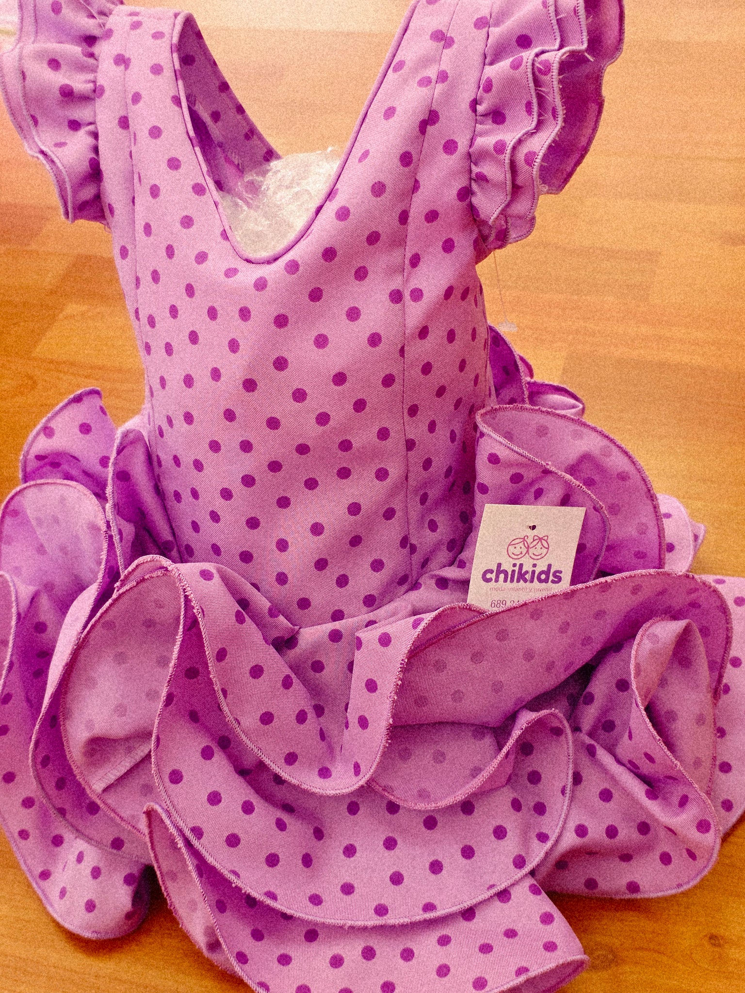 Vestido de flamenca con tres volantes malva con lunar malva.