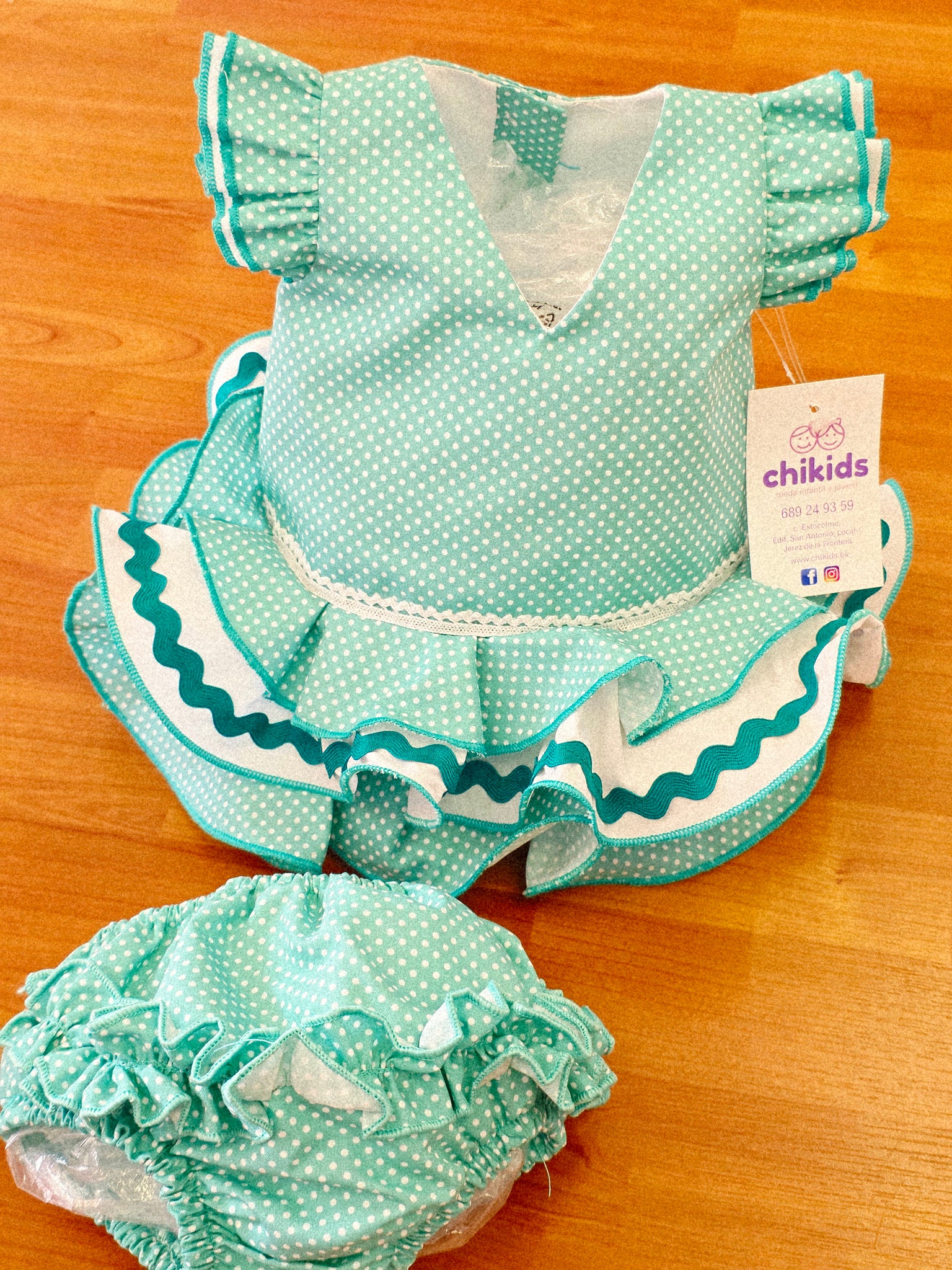 Vestido y braga Flamenca "Rosarillo" verde agua/blanco 3 a 18 meses.