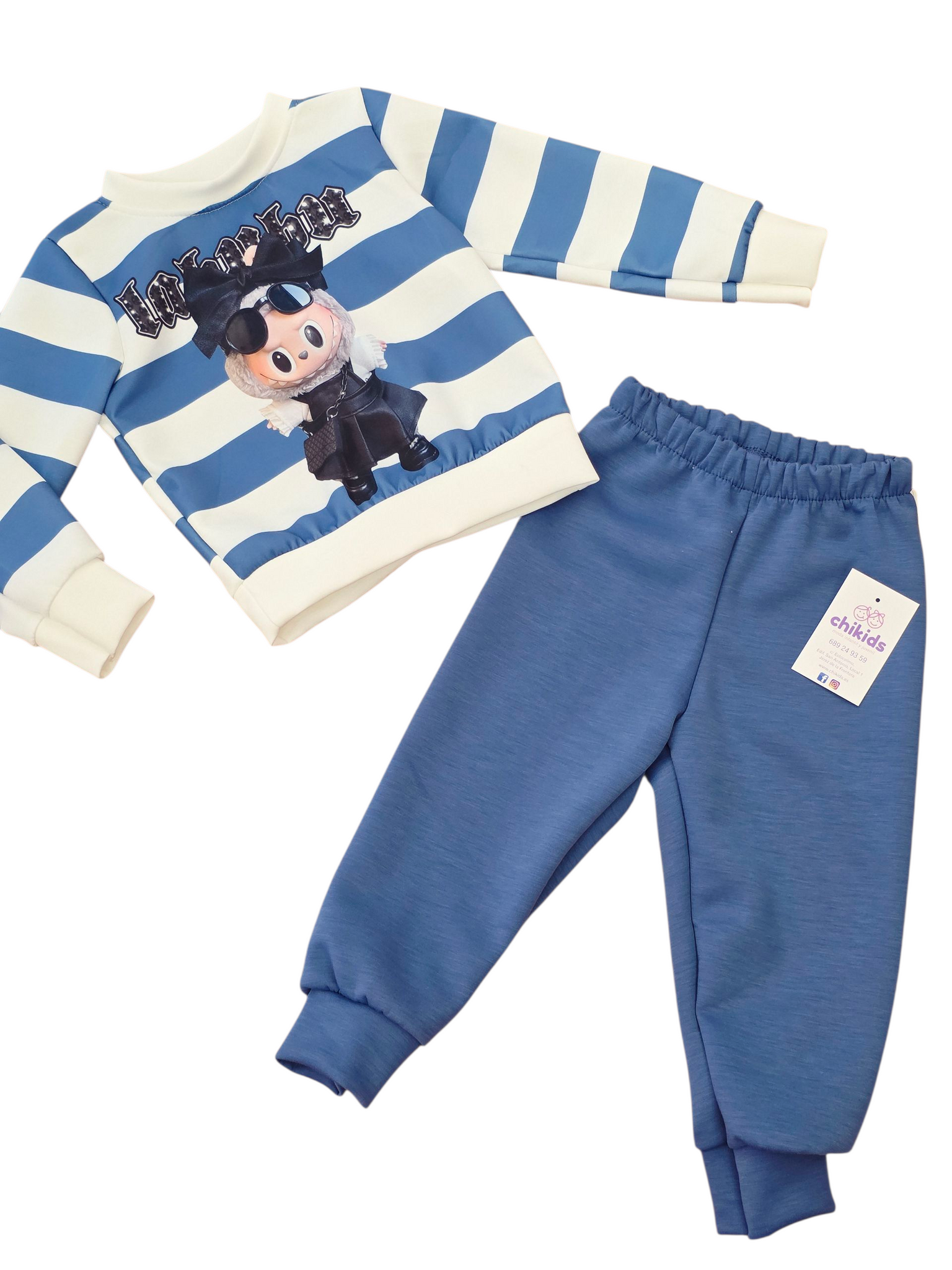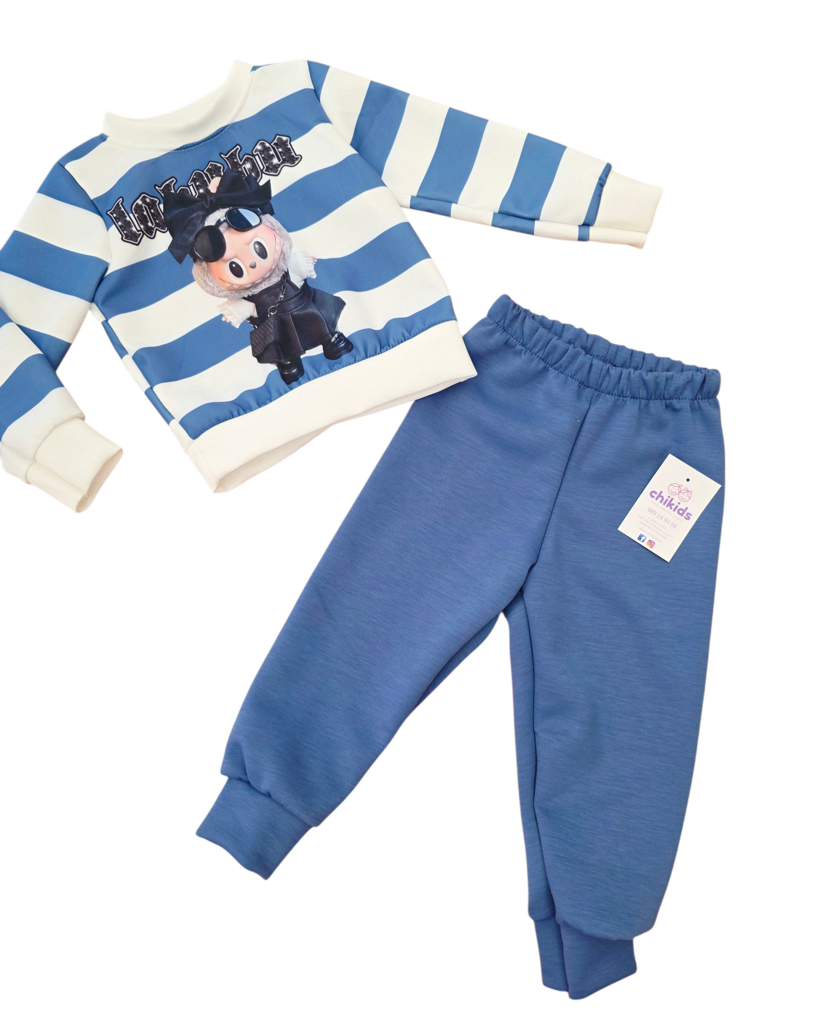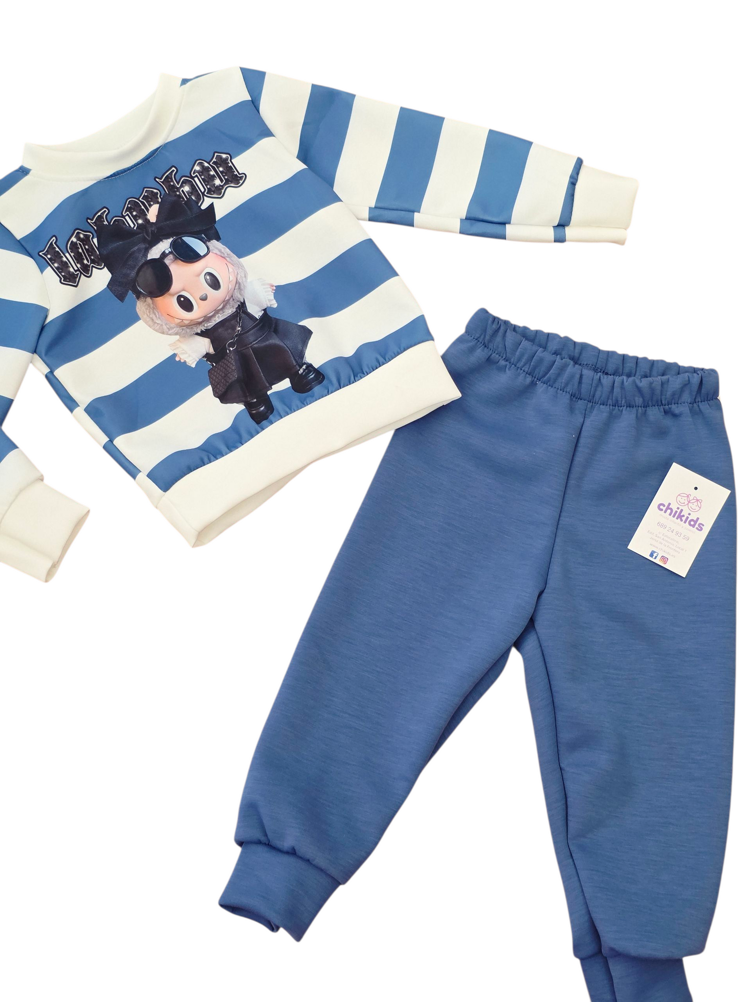 Conjunto de chándal compuesto de sudadera de rayas azul y blanca con detalle de labubu y pantalón de felpa a juego.