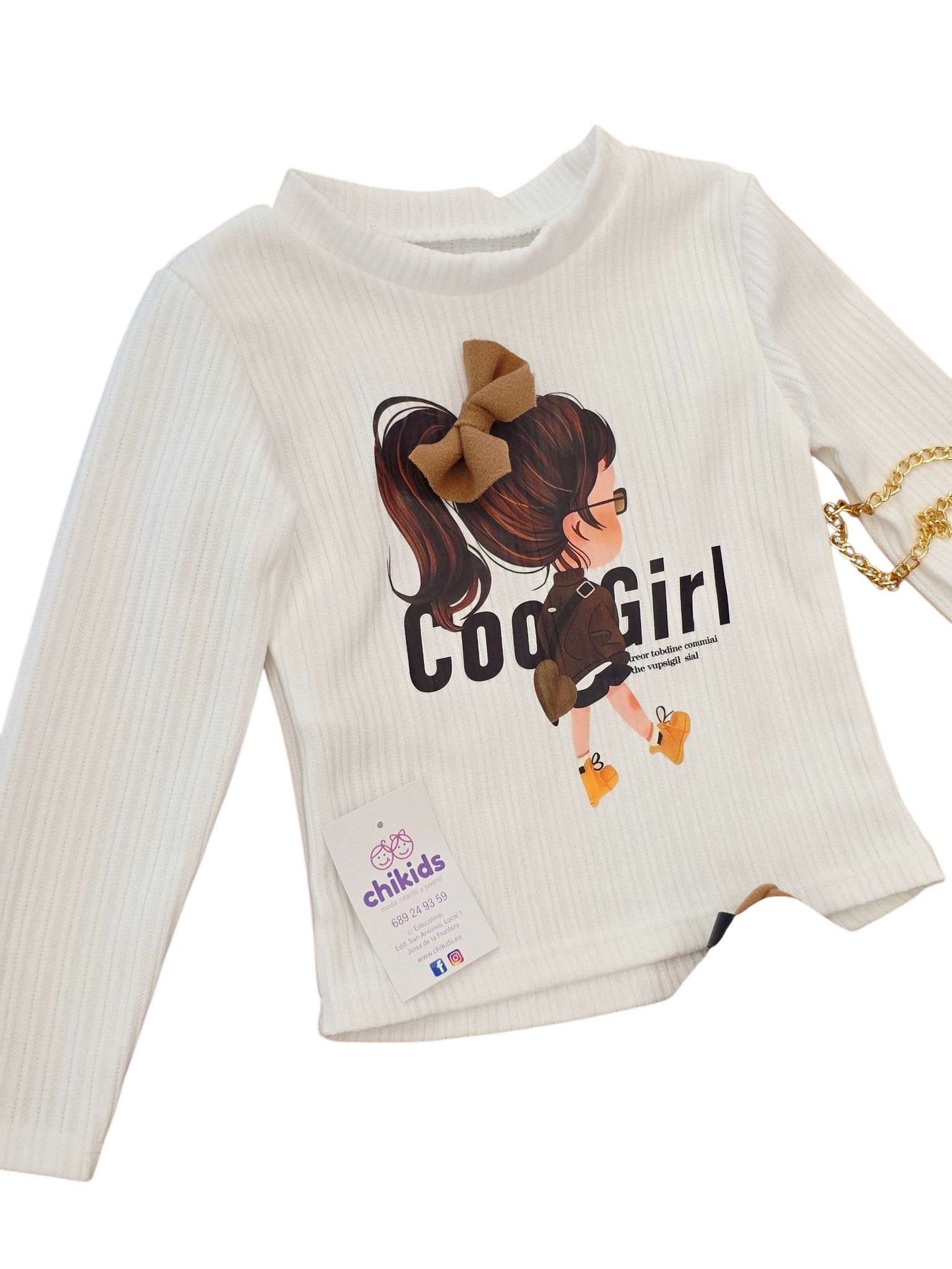Conjunto compuesto de camiseta con detalle de niña combinado con pantalón camel y bolso a juego.
