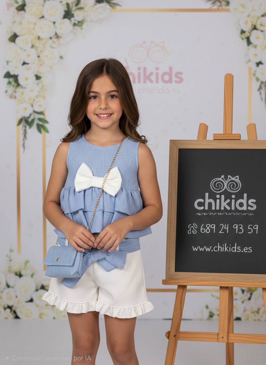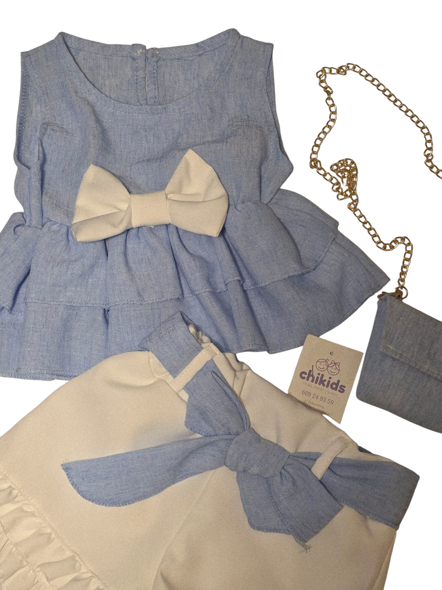 Conjunto compuesto de camisa azul con dos volantes y lazo blanco combinado con pantalón blanco y lazo azul y bolso a juego azul.