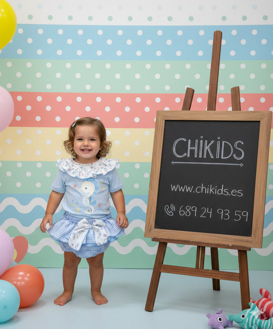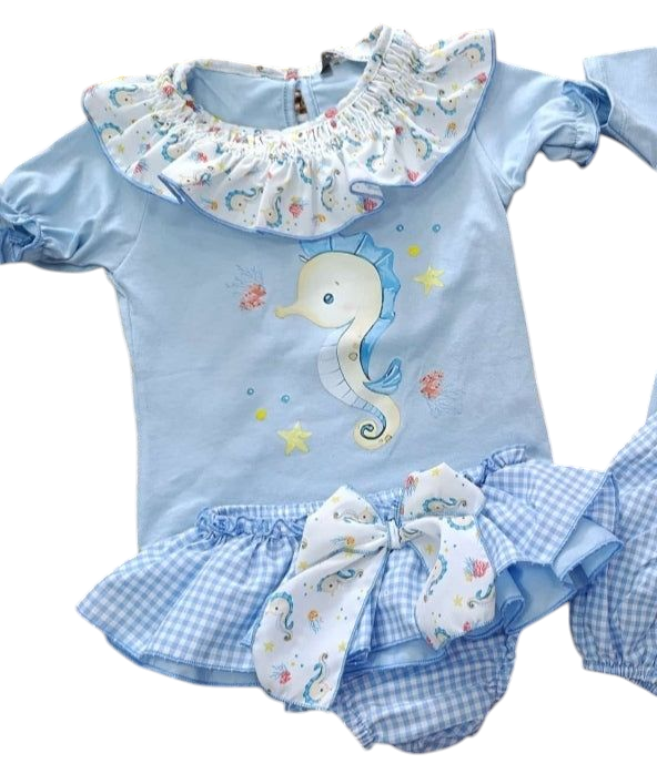 Conjunto compuesto de camiseta celeste con detalle de caballito de mar combinados con Braga falda vichy azul y blanca