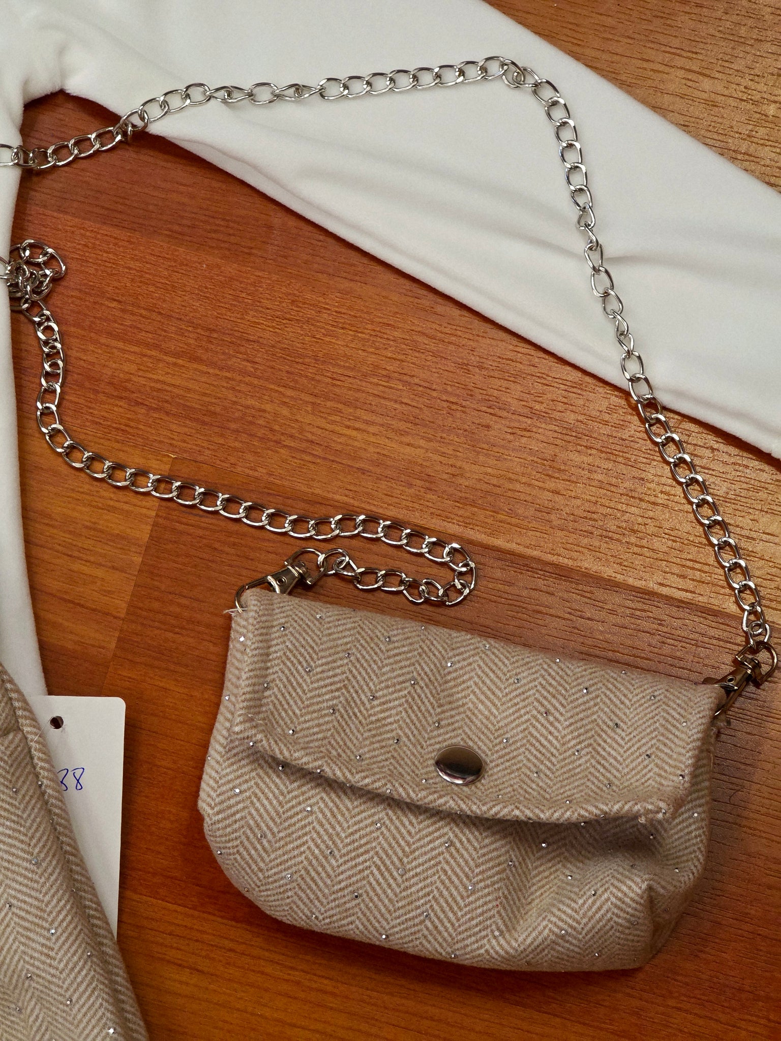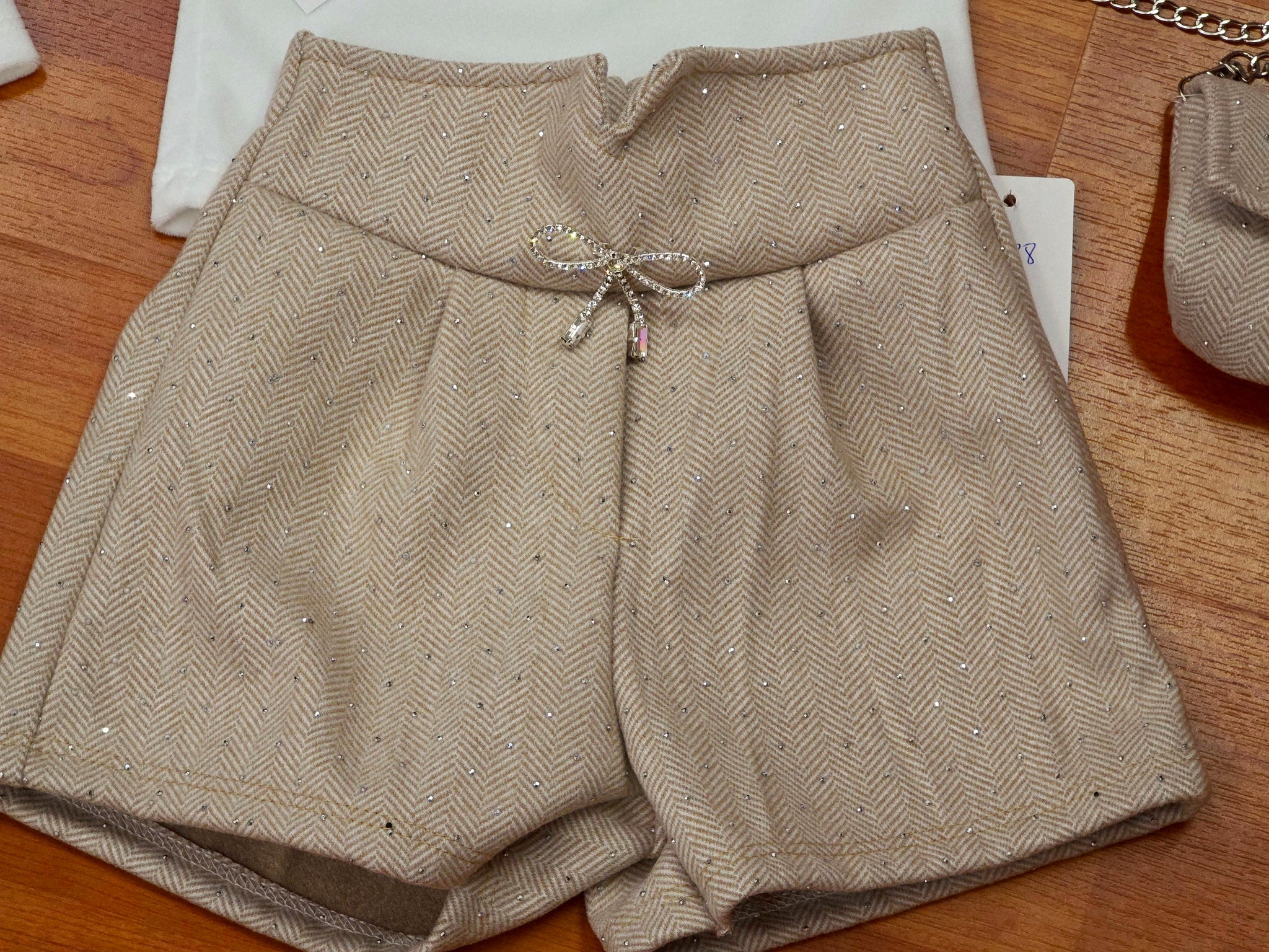 Conjunto de tres piezas de camiseta blanca. Combinado con pantalón de talle alto en camel y bolso a juego