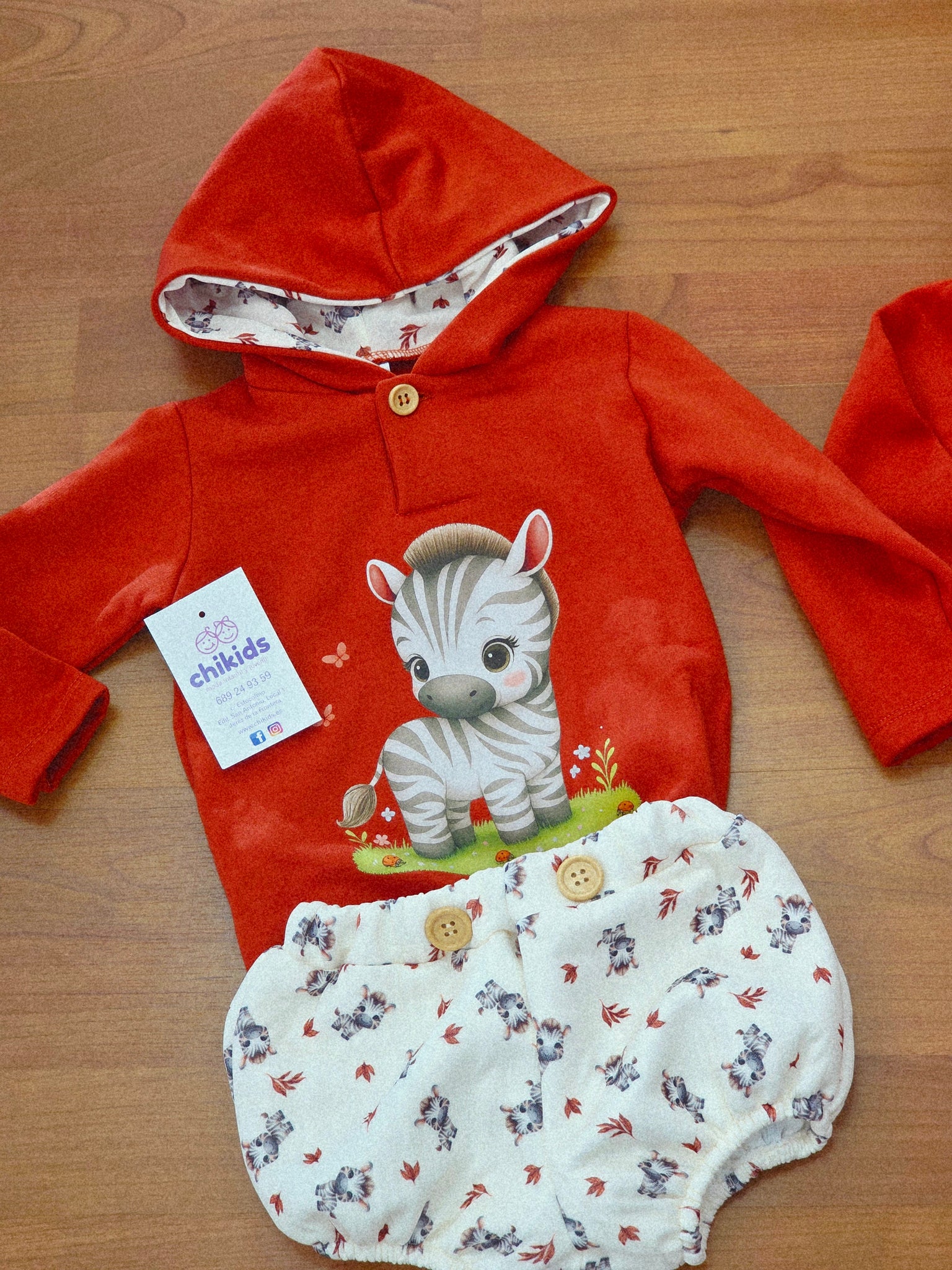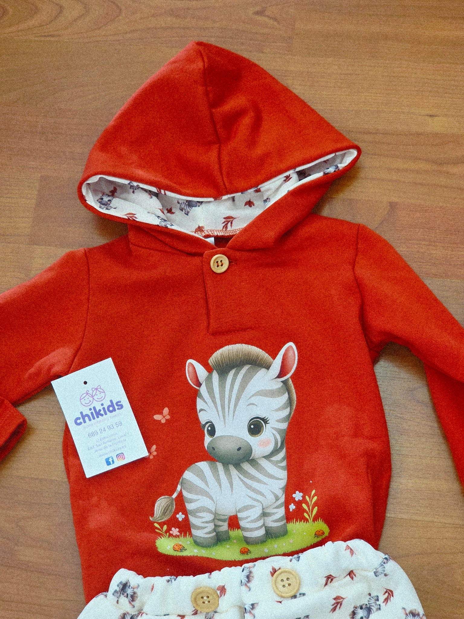 Conjunto compuesto de sudadera en color cazuela con detalle de cebrita lleva gorro y combinado combin con ranita a juego