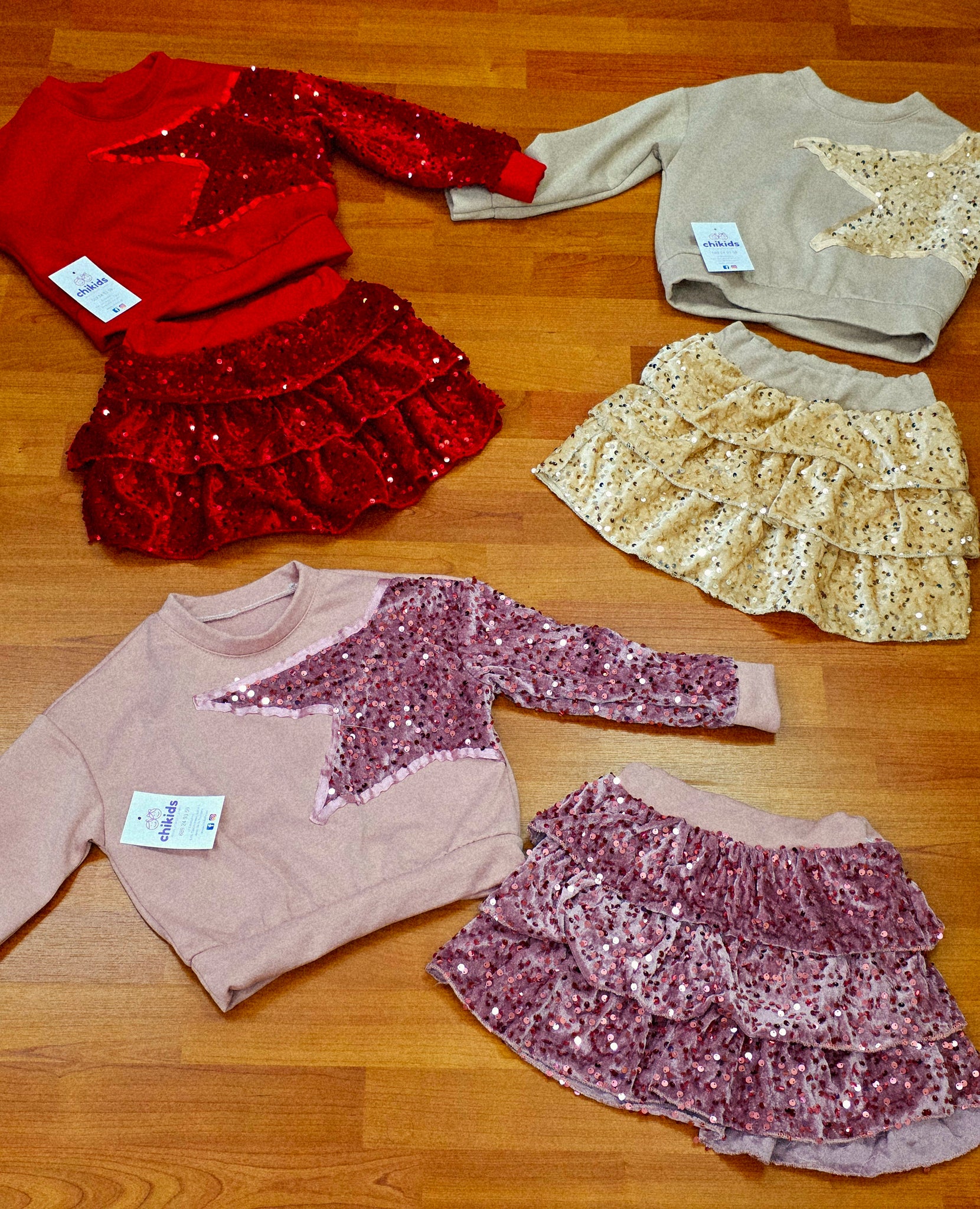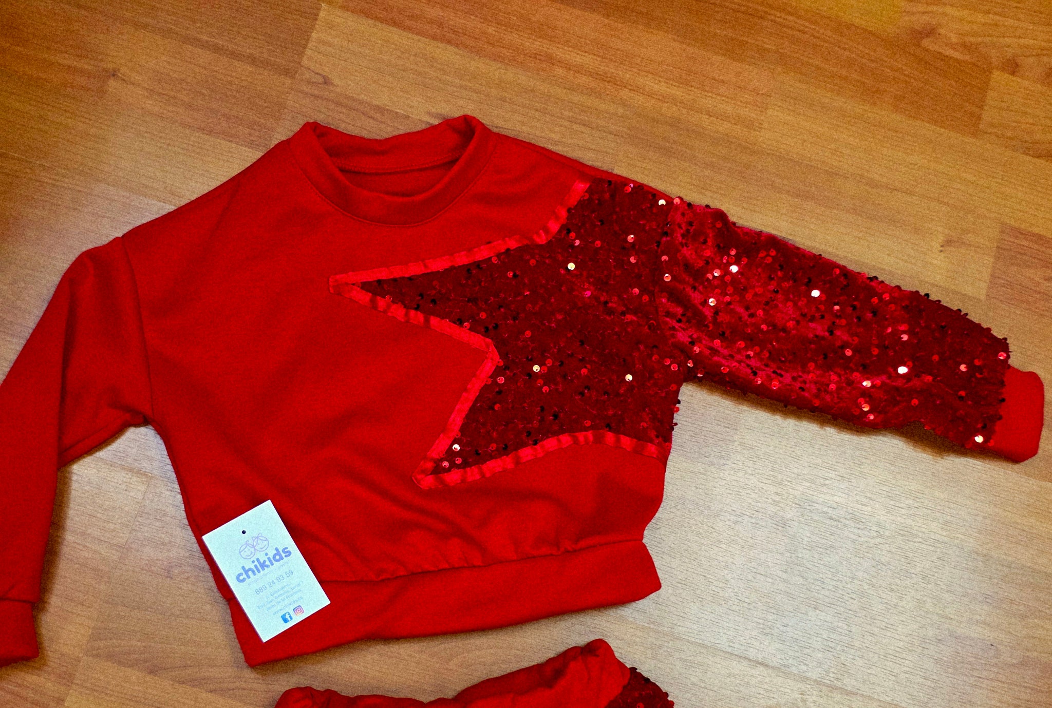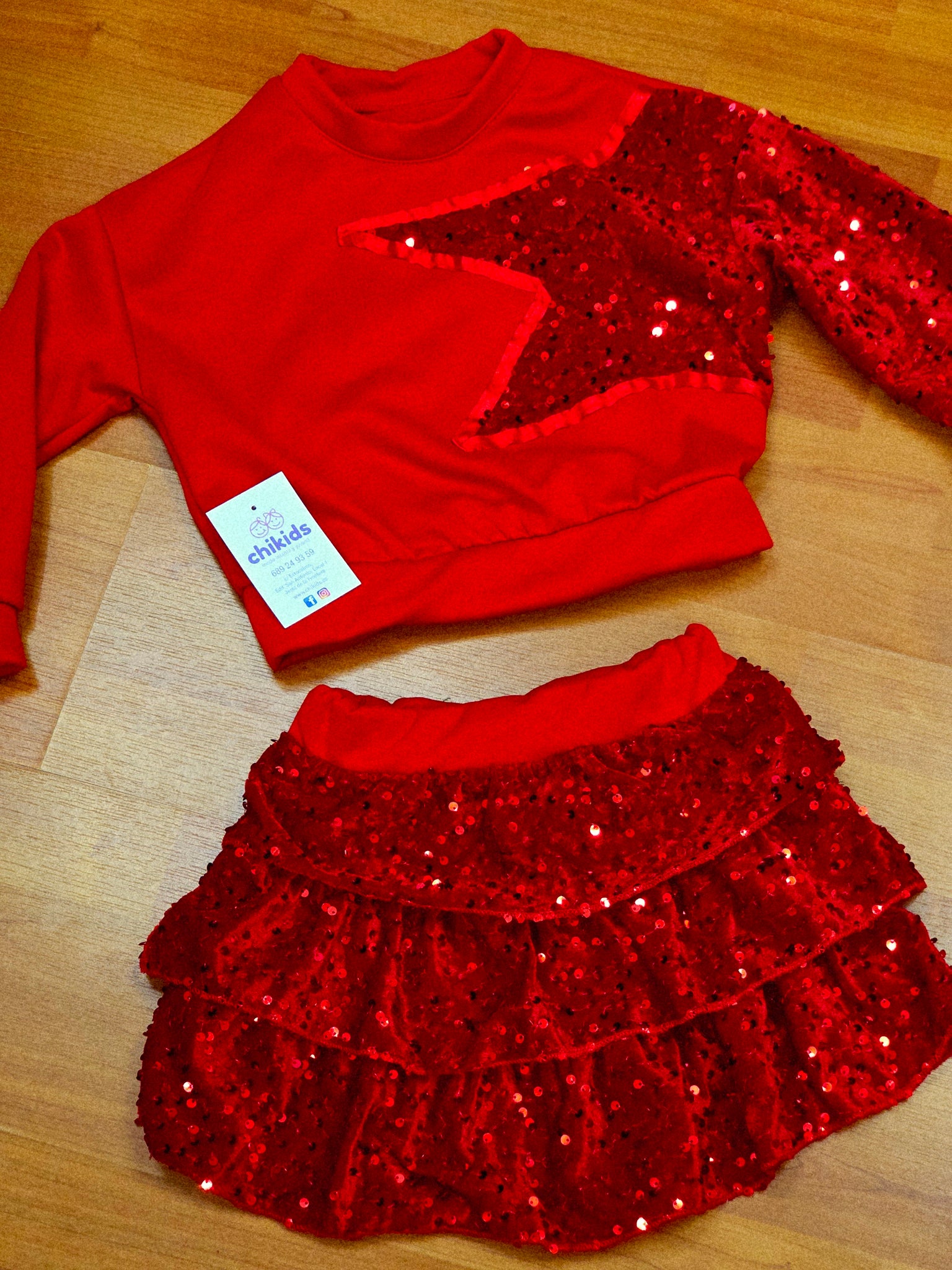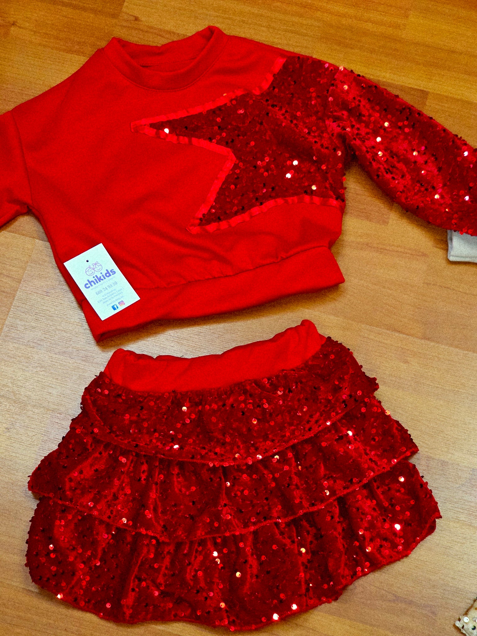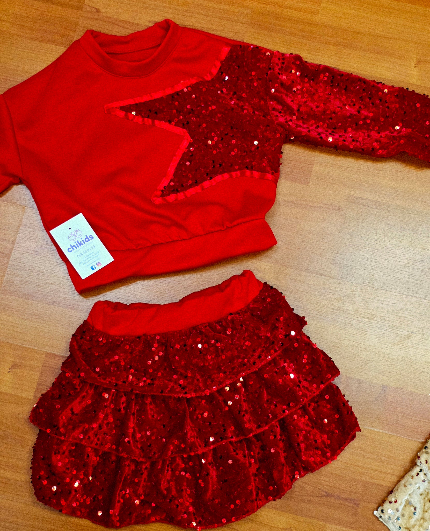 Conjunto compuesto de sudadera roja con detalle de estrellas de lentejuejuela y falda roja de lentejuela a juego.
