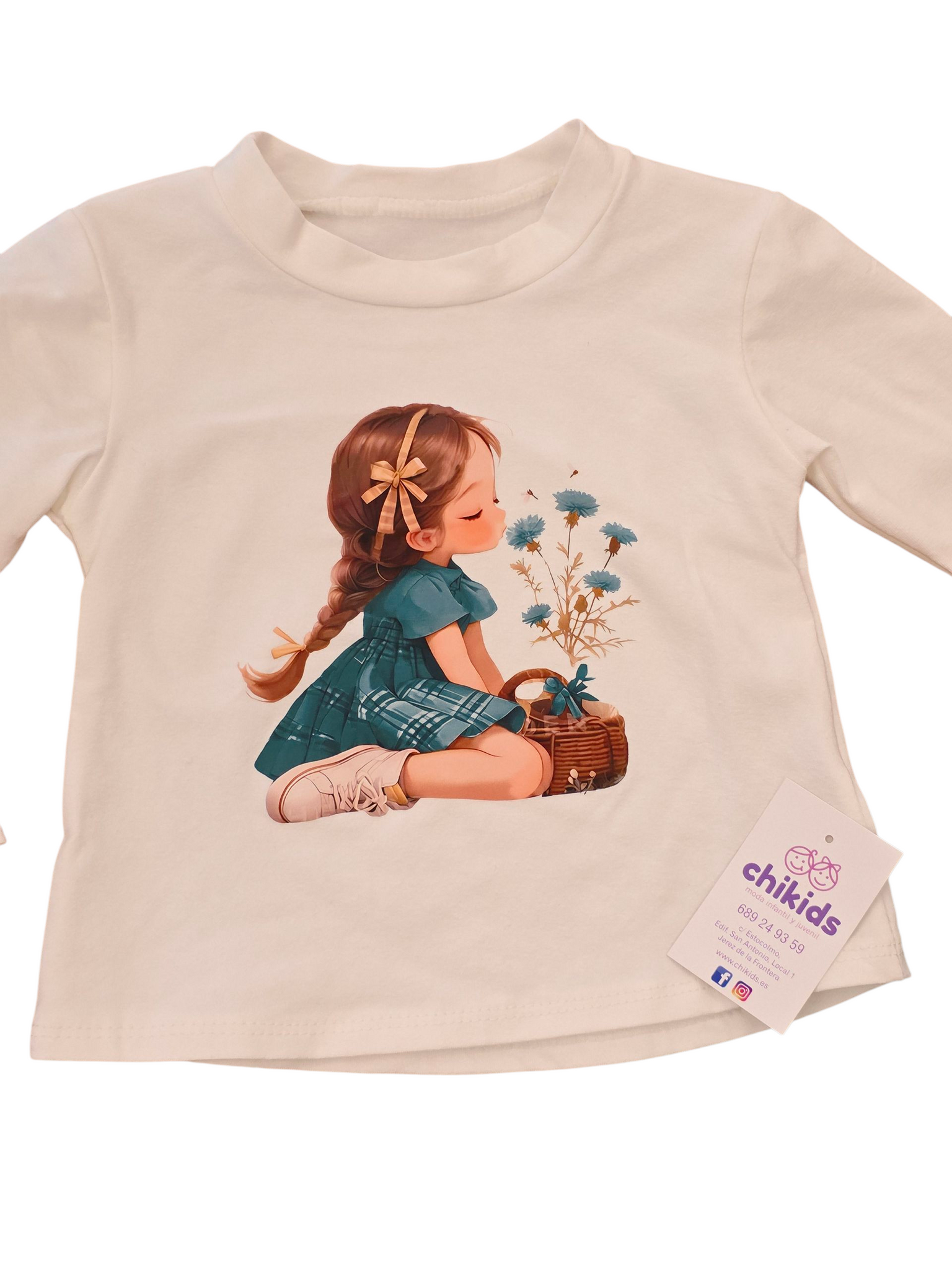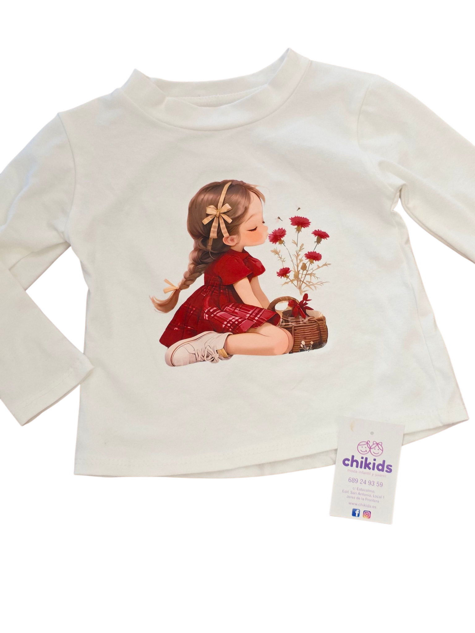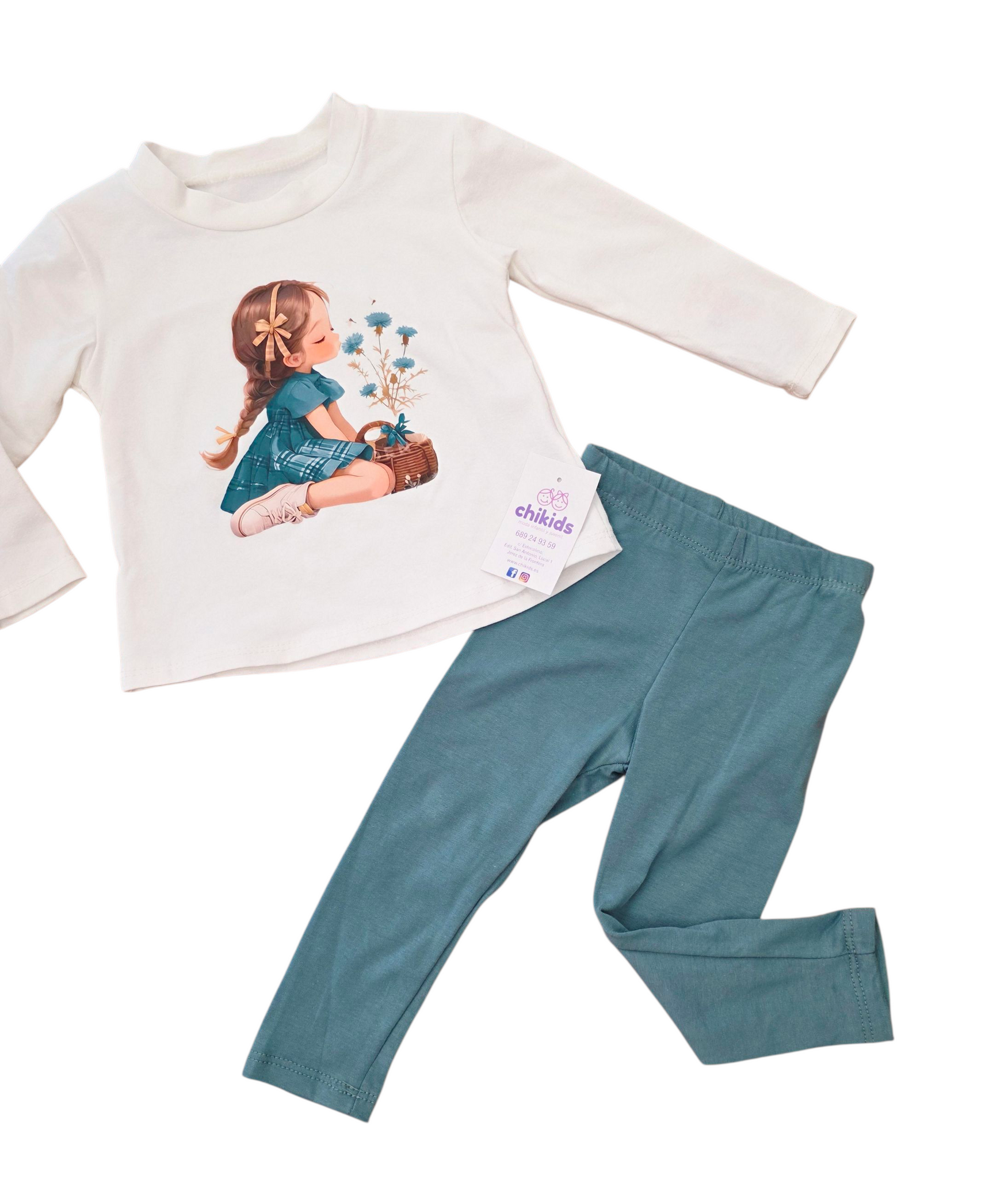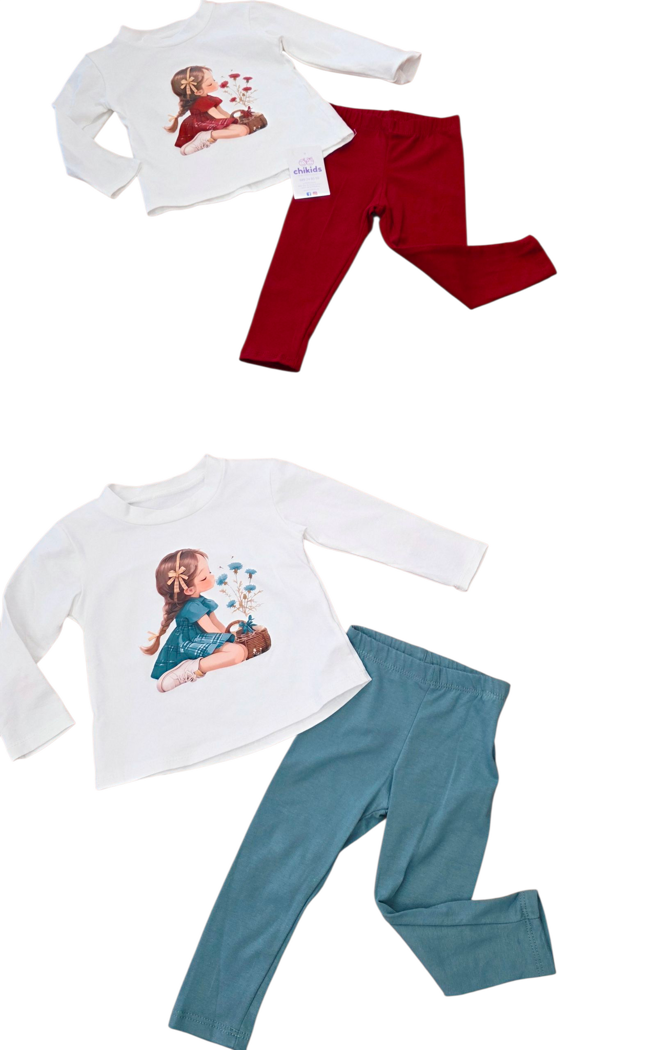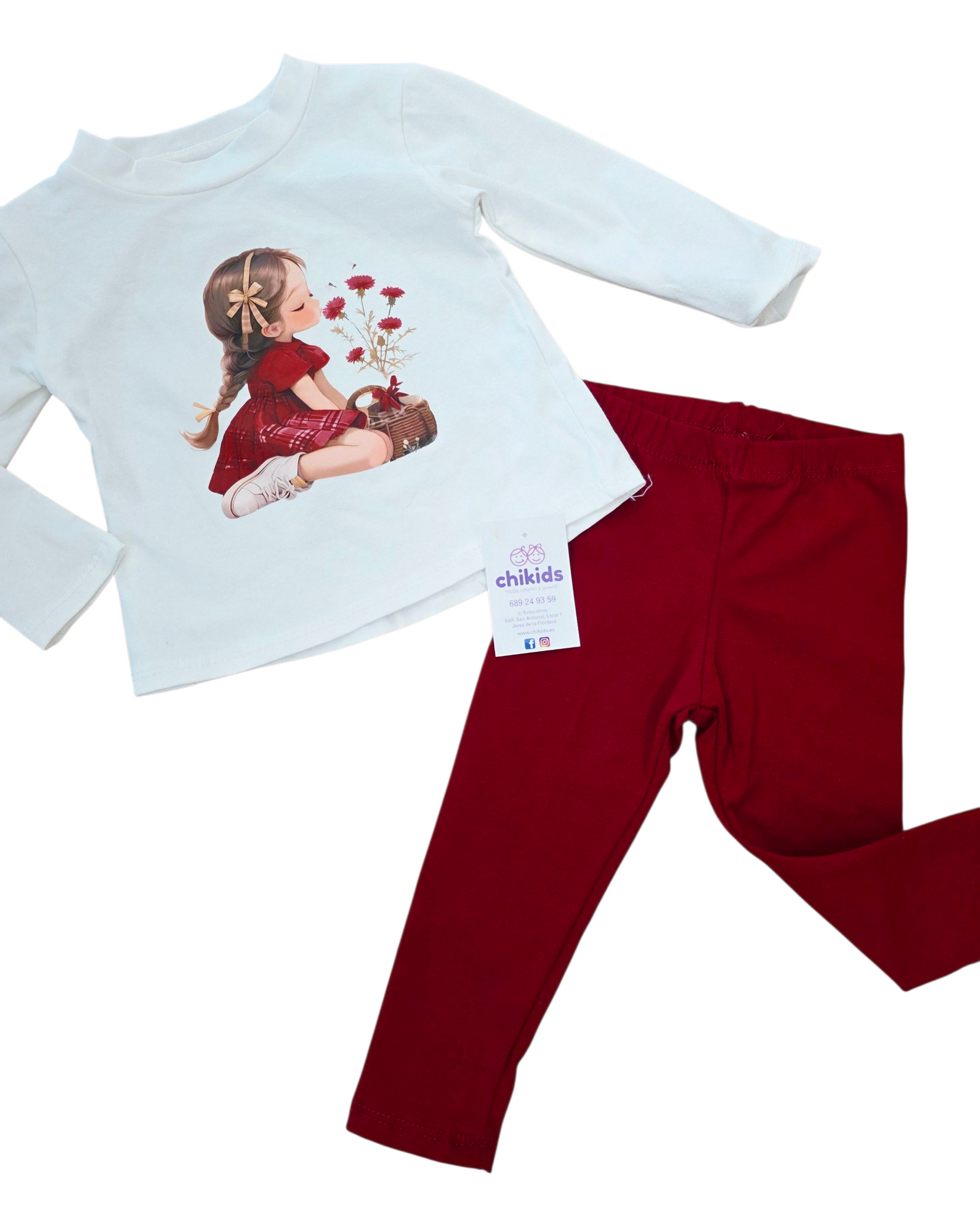 Conjunto compuesto de camiseta con detalle de niña con cesto con flores, viene en dos colores con legin granate o con legin verde.