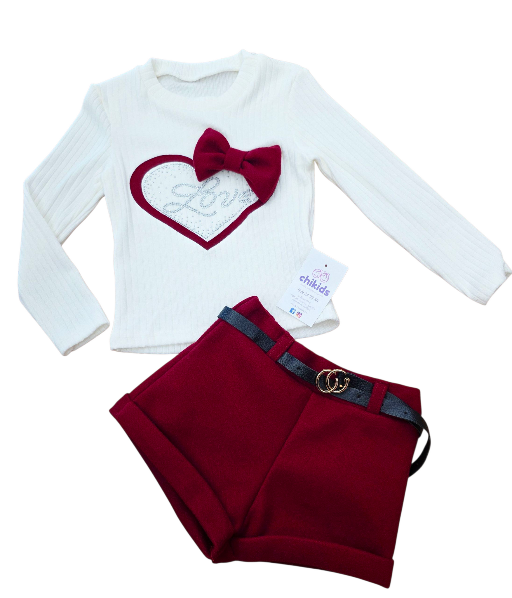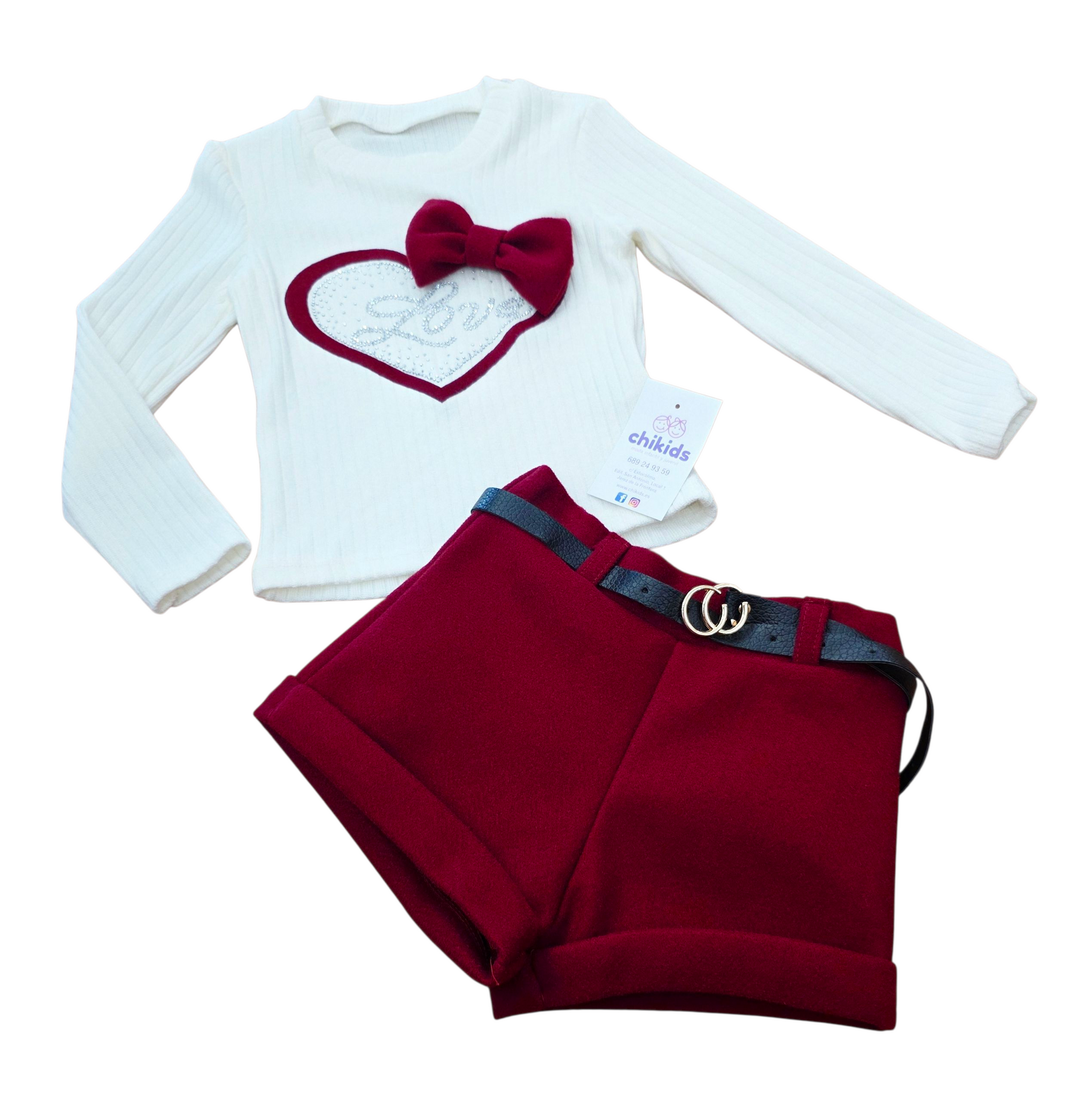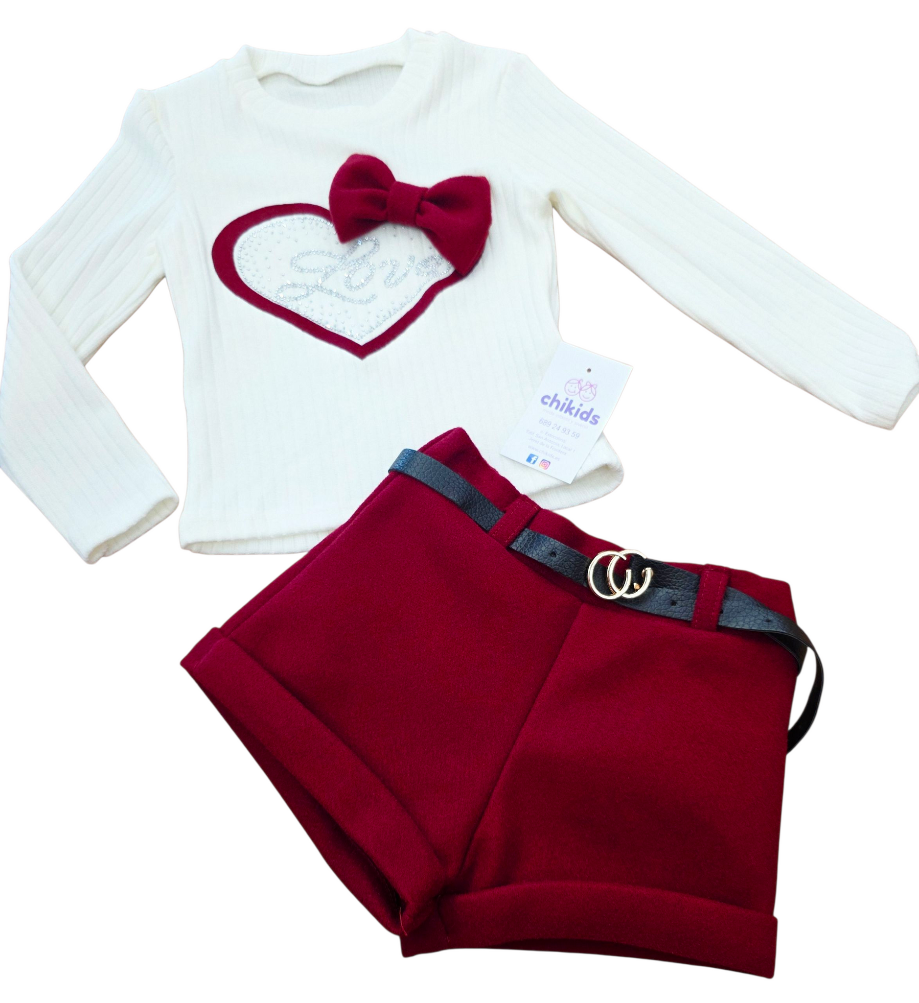 Conjunco compuesto de jersey de canutillo blanco con corazón combinado con pantalón granate con correa.