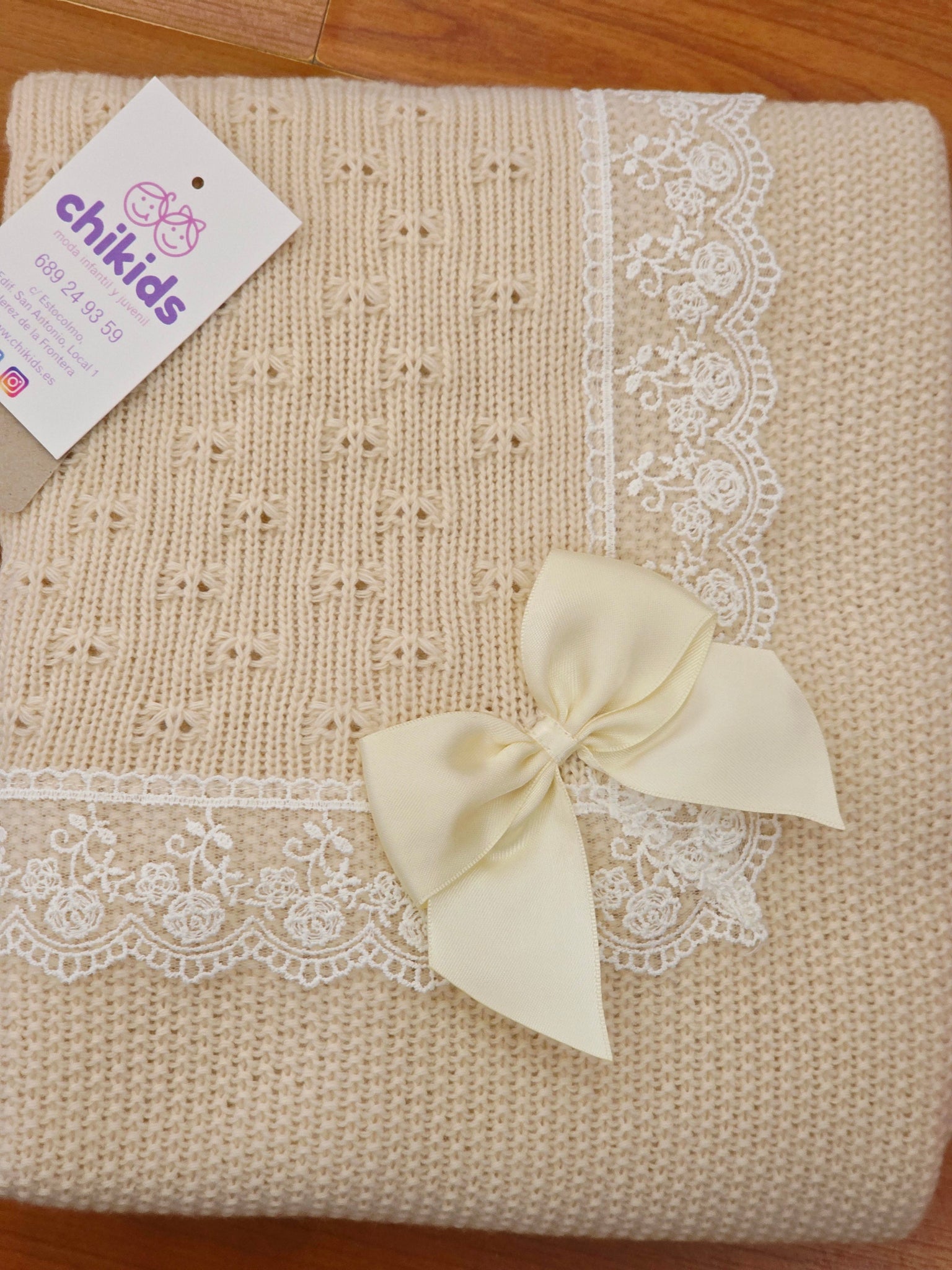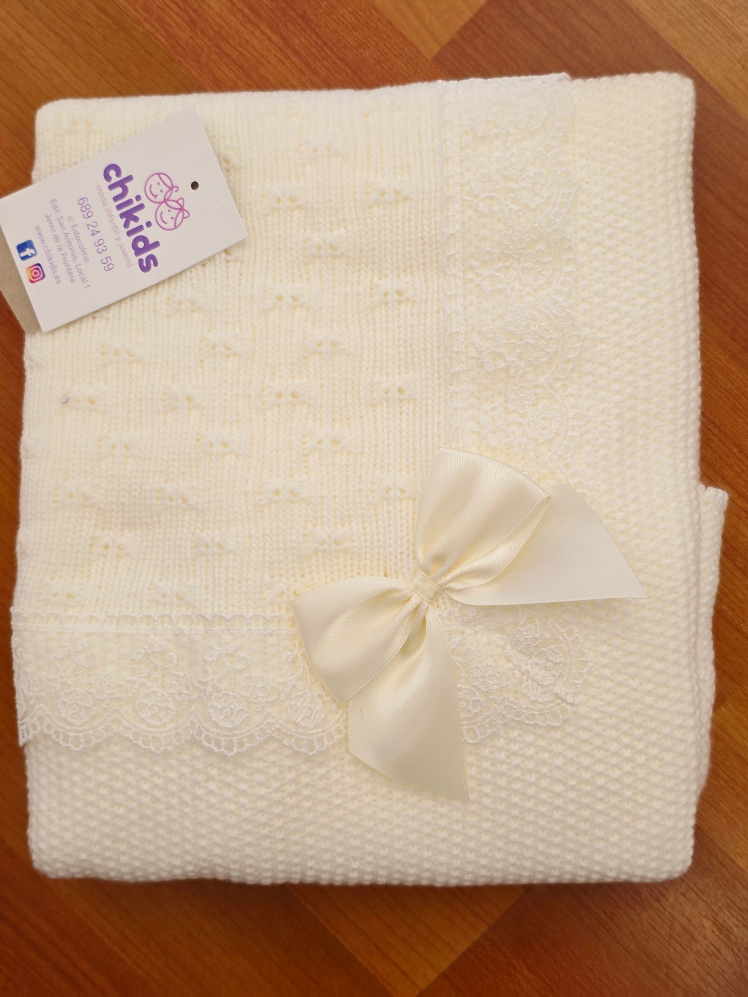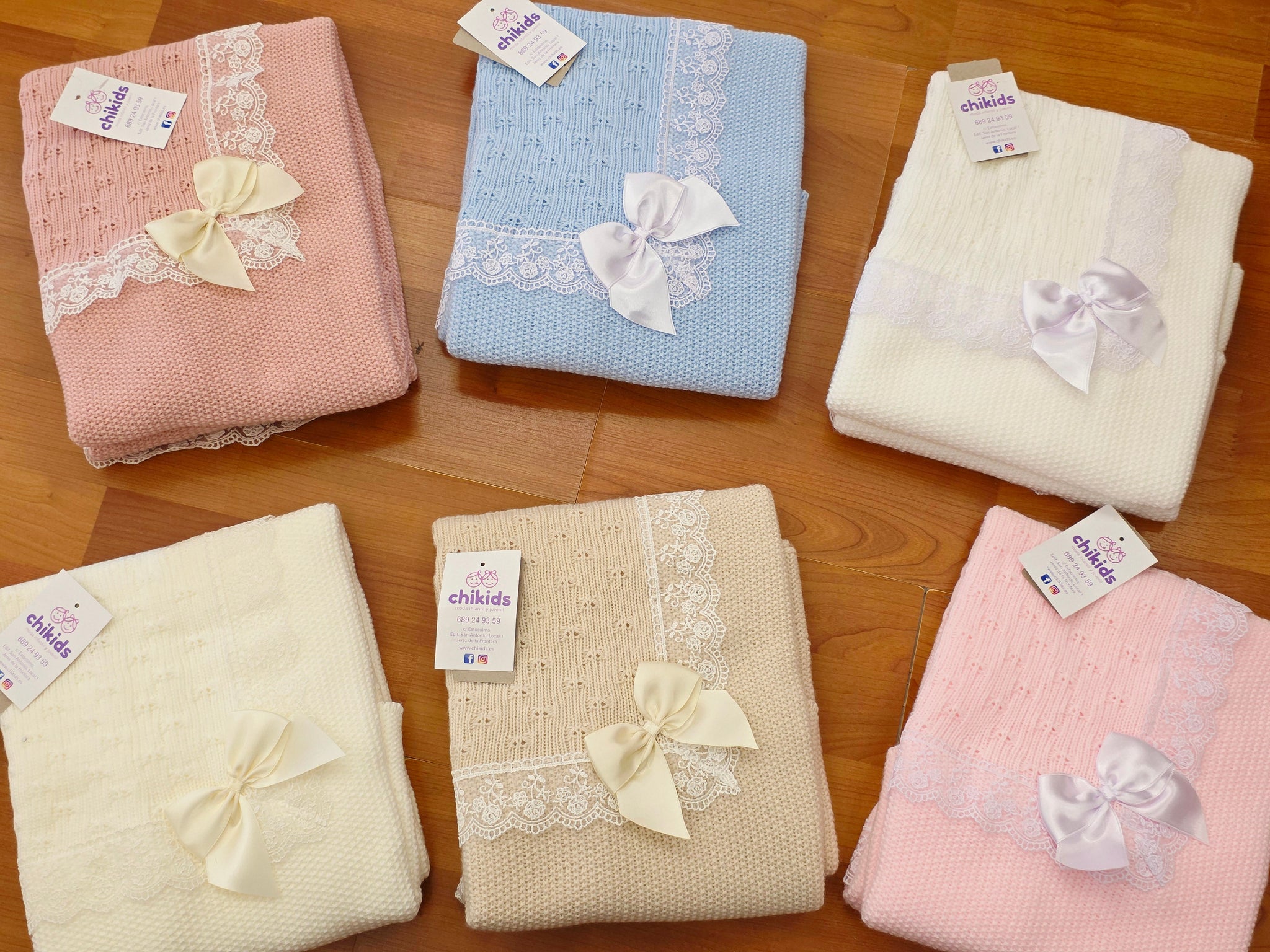 Toquilla de lana con puntilla y lazo en varios colores.