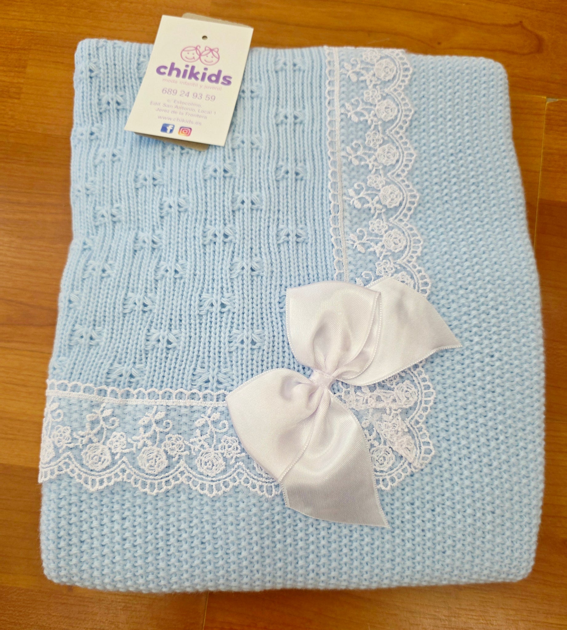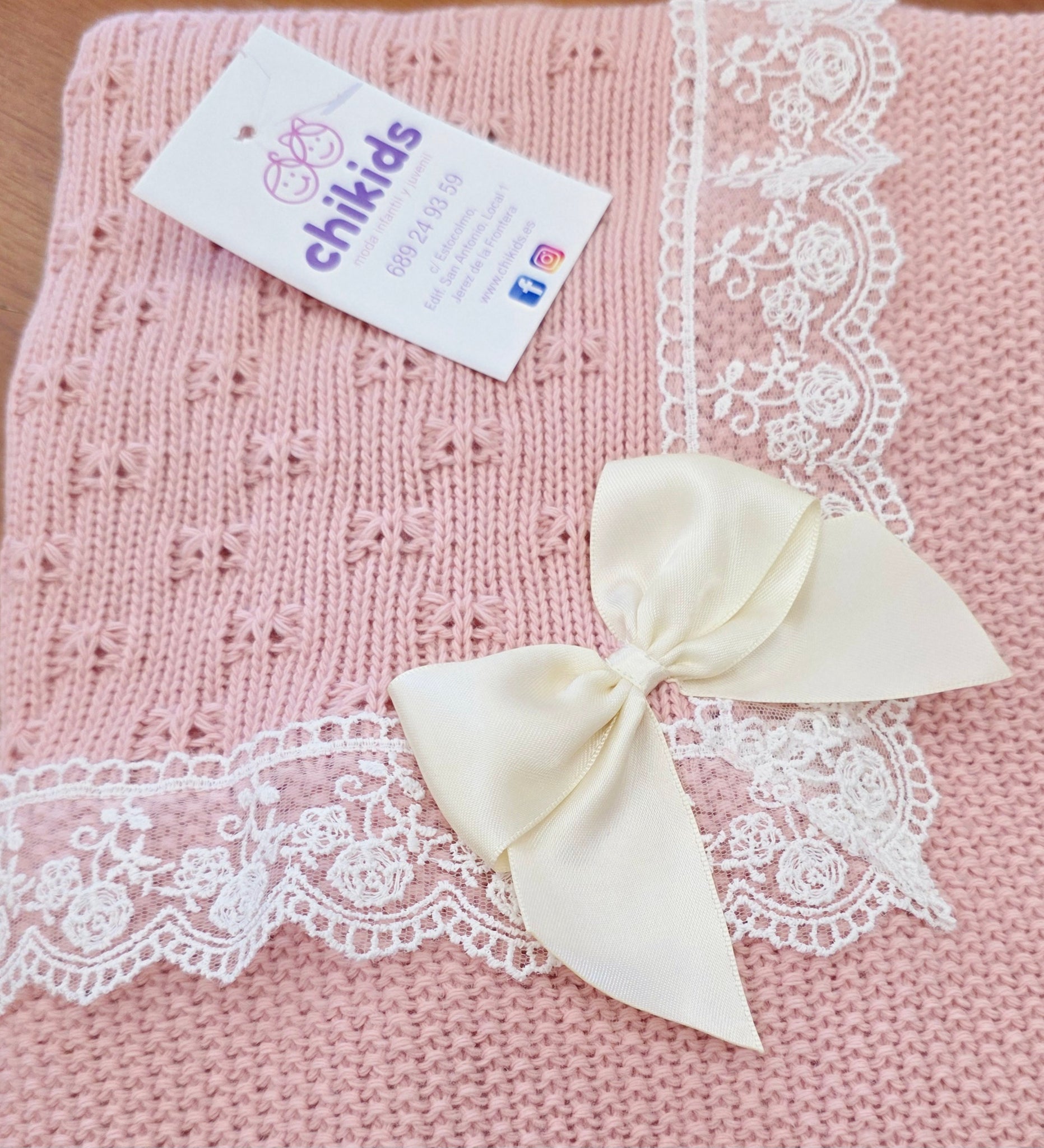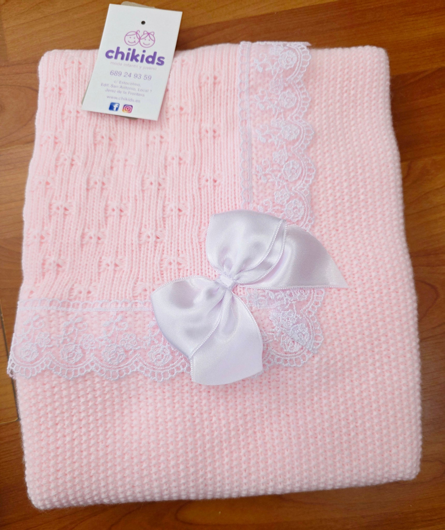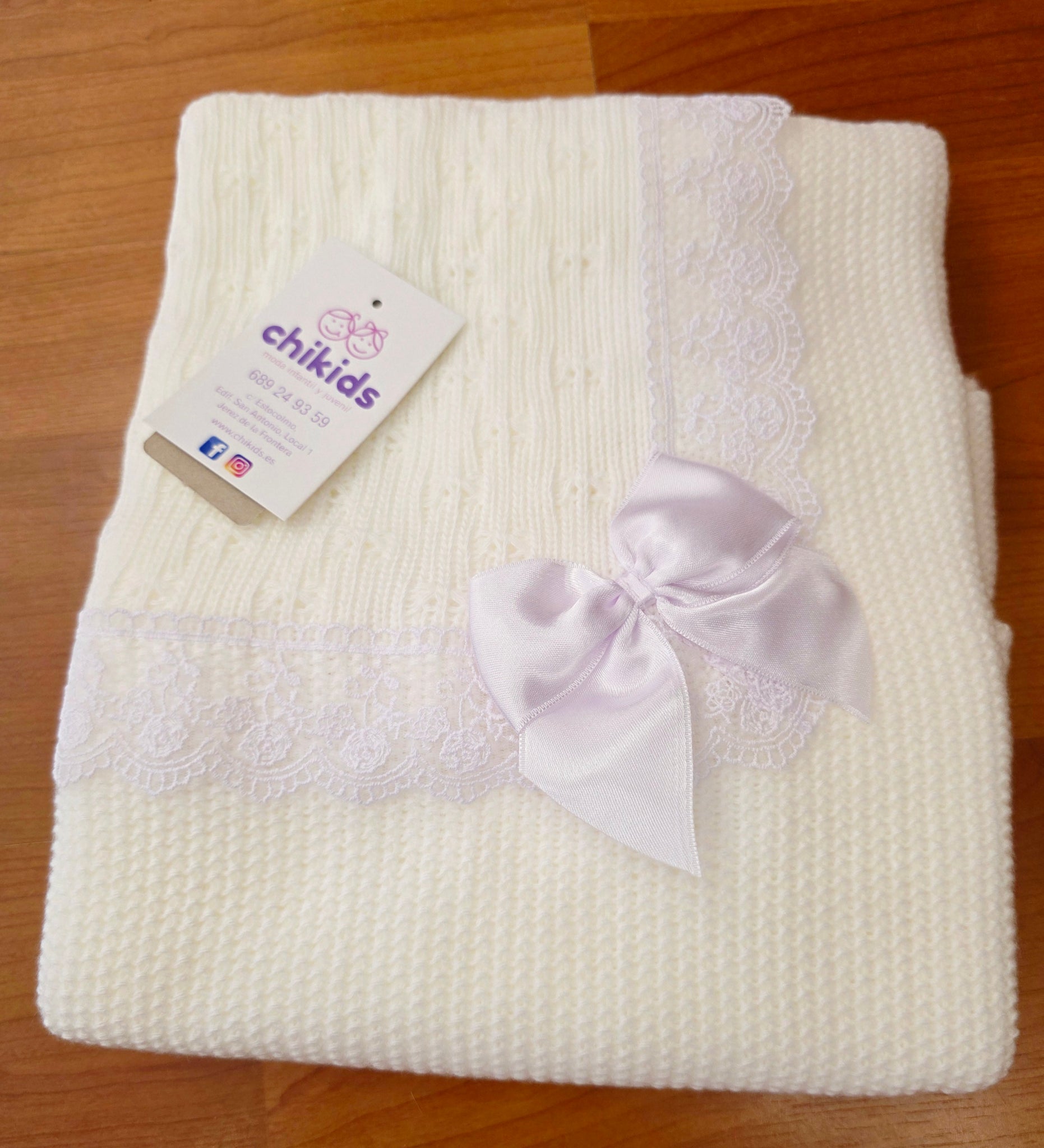 Toquilla de lana con puntilla y lazo en varios colores.