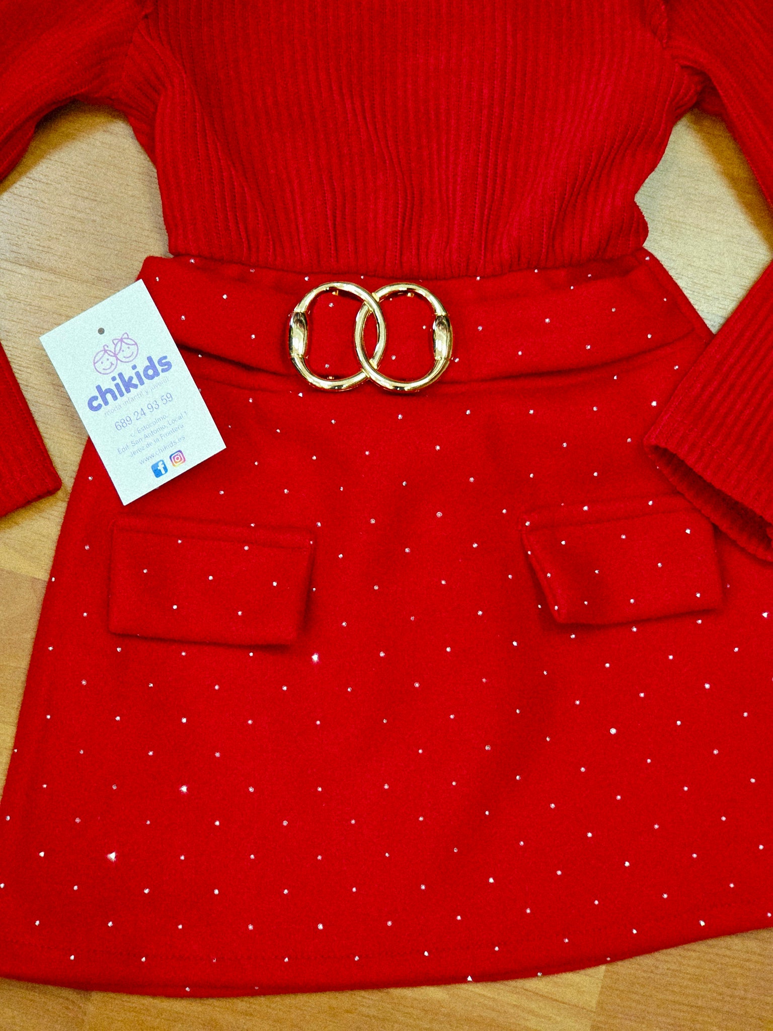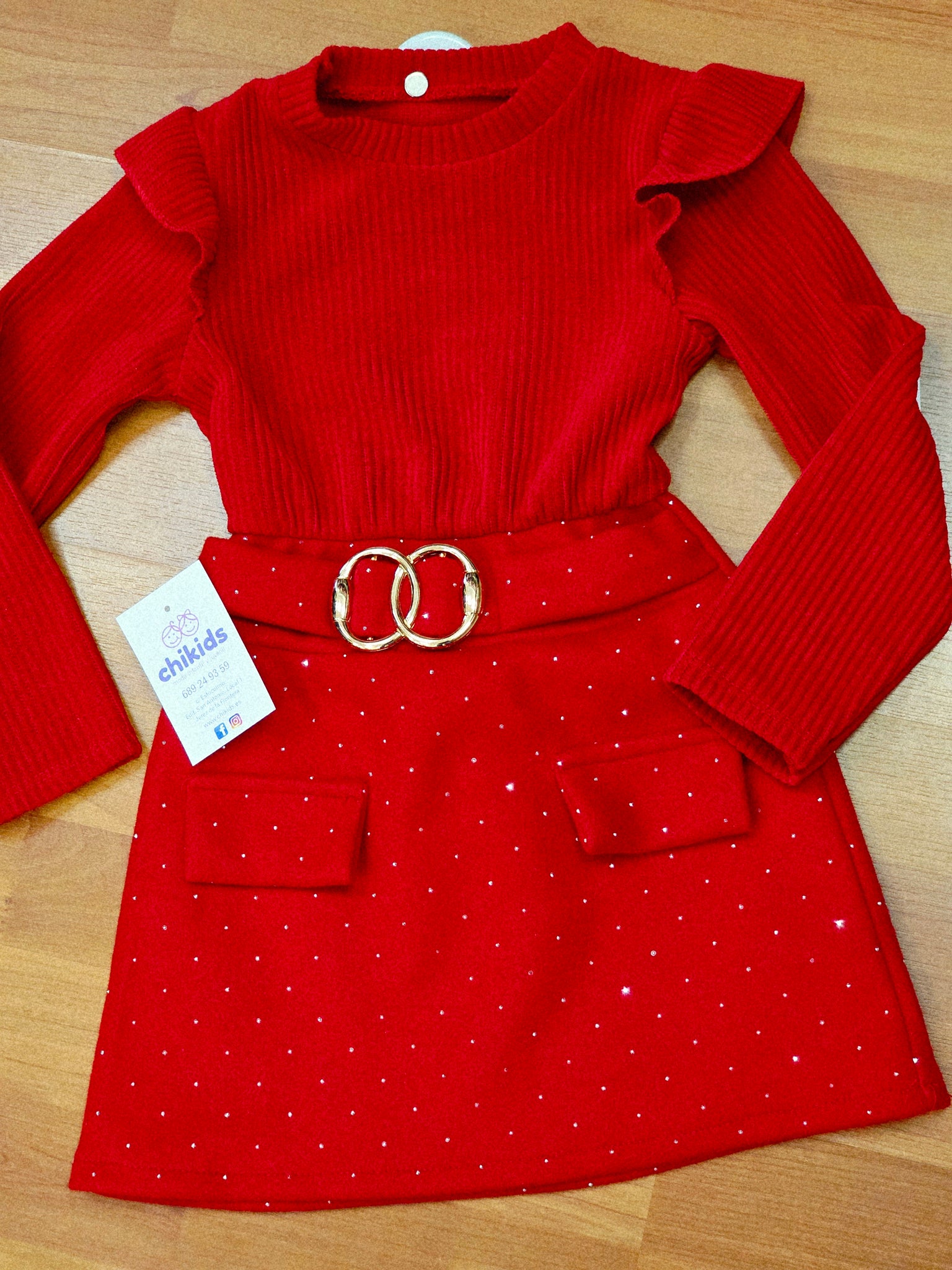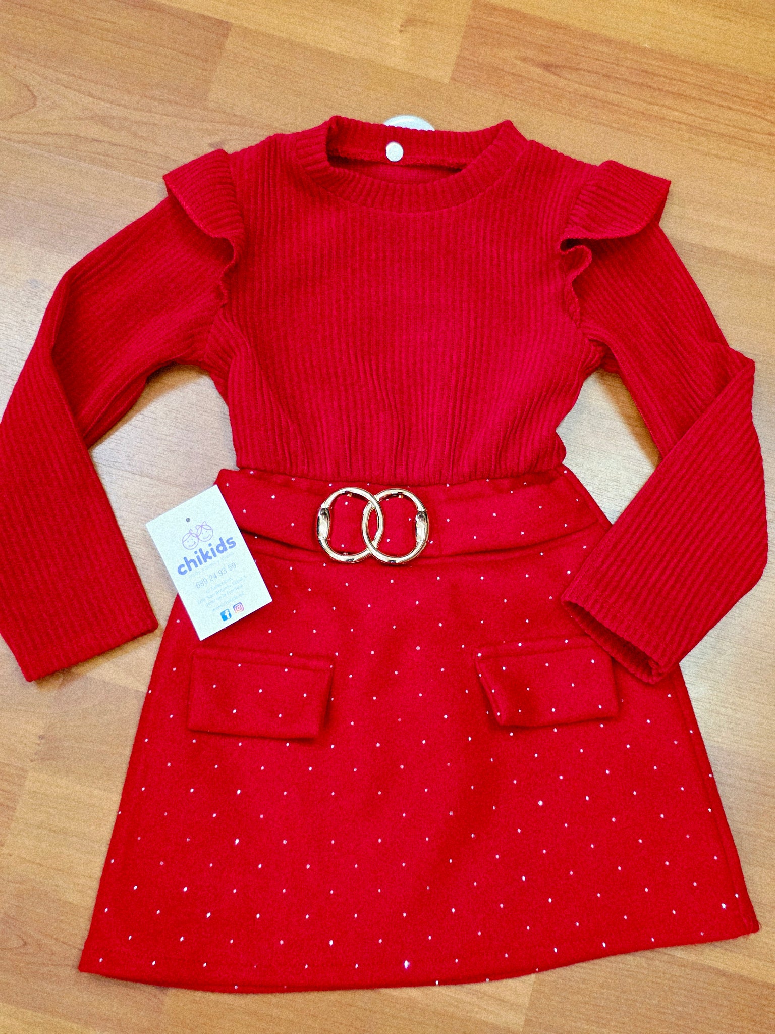 Vestido rojo con parte de arriba de canale y parte de la falda roja con brillo combinado con bolso rojo a juego.
