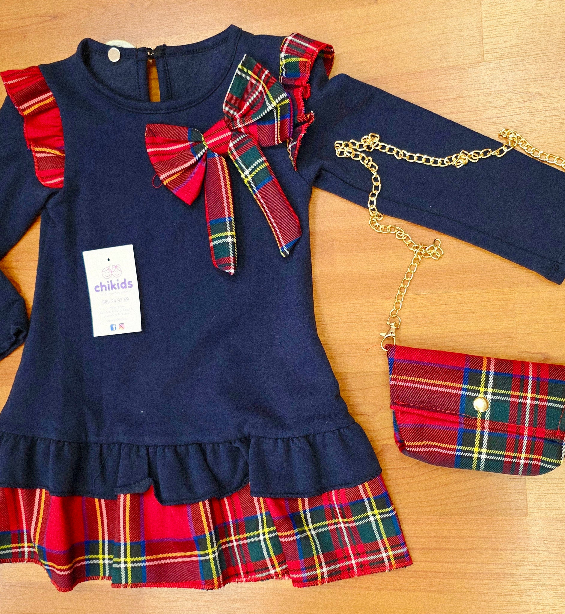 Vestido con cuerpo azul y bajo encuadro rojo y azul escoces a juego con bolso